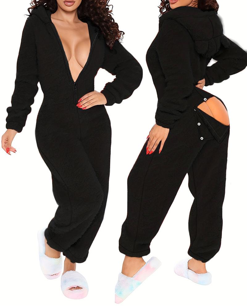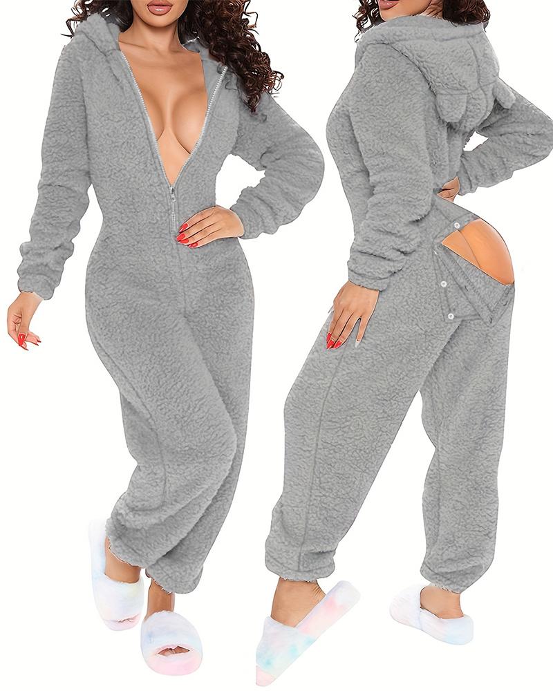 3D Ear Buttoned Flap Functional Fluffy Lounge Jumpsuit |