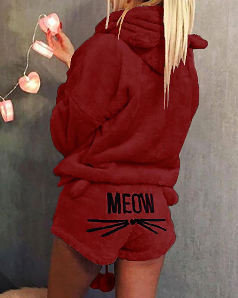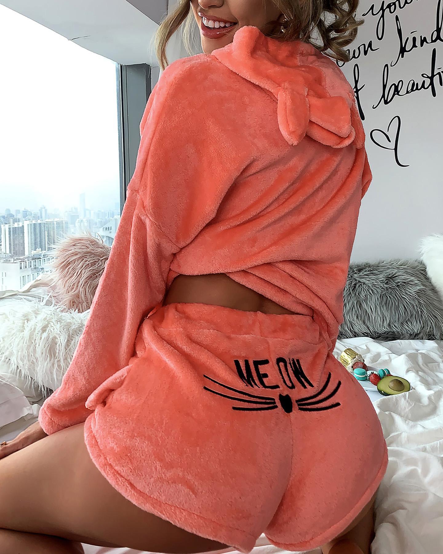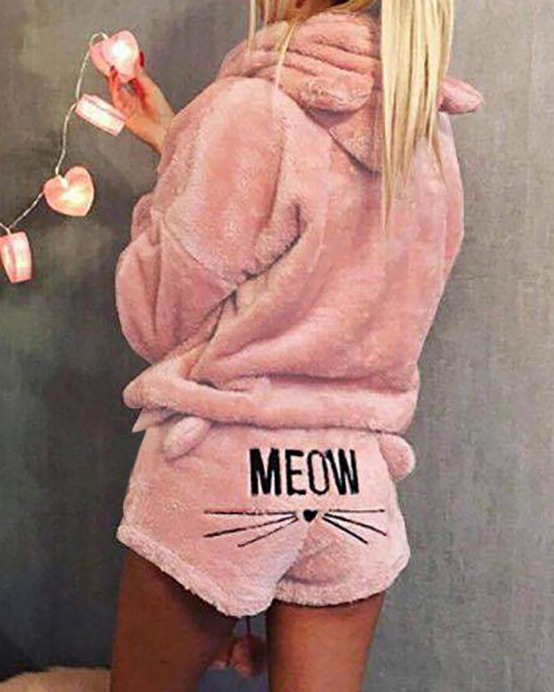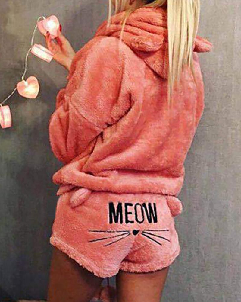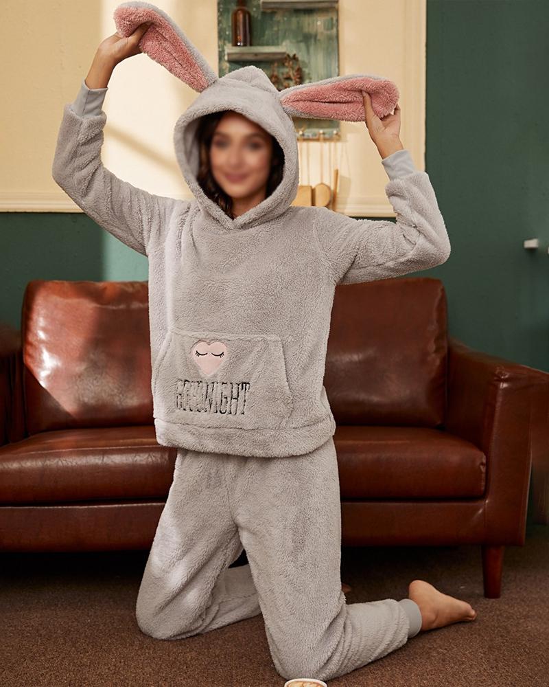Heart Letter Embroidery Hooded Fluffy Pajamas Set |