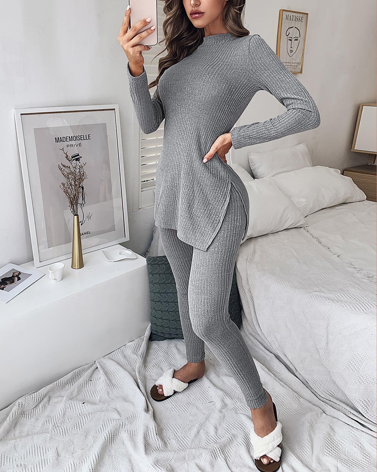 Slit Long Sleeve High Neck Knit Pajamas Set |