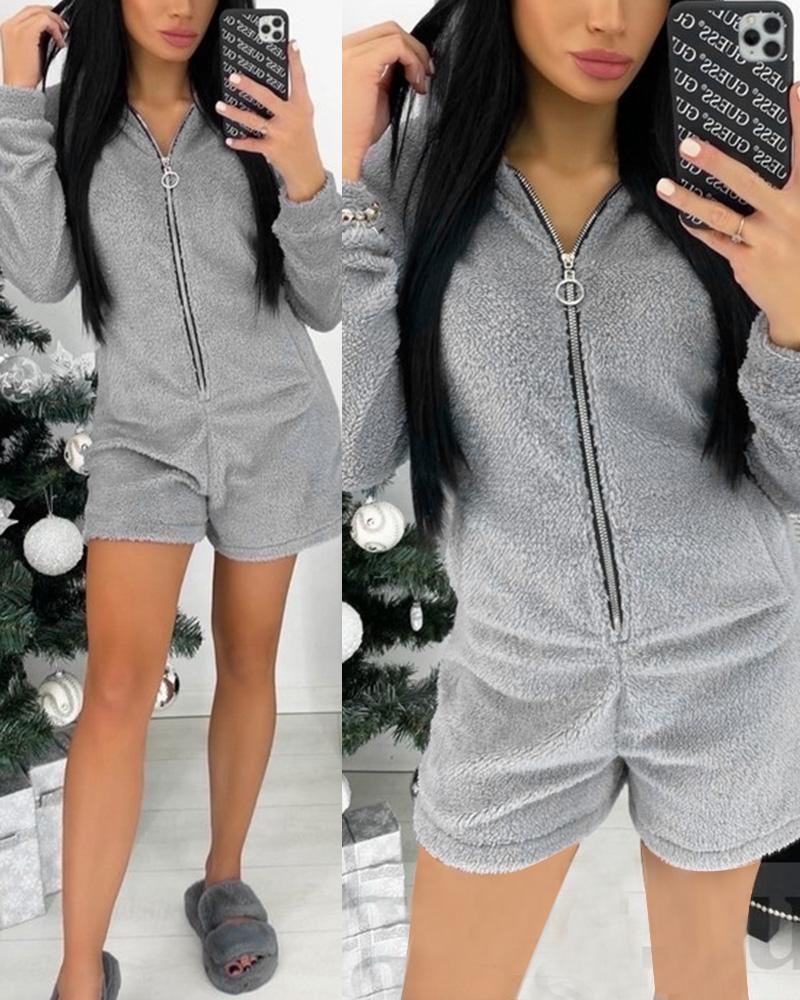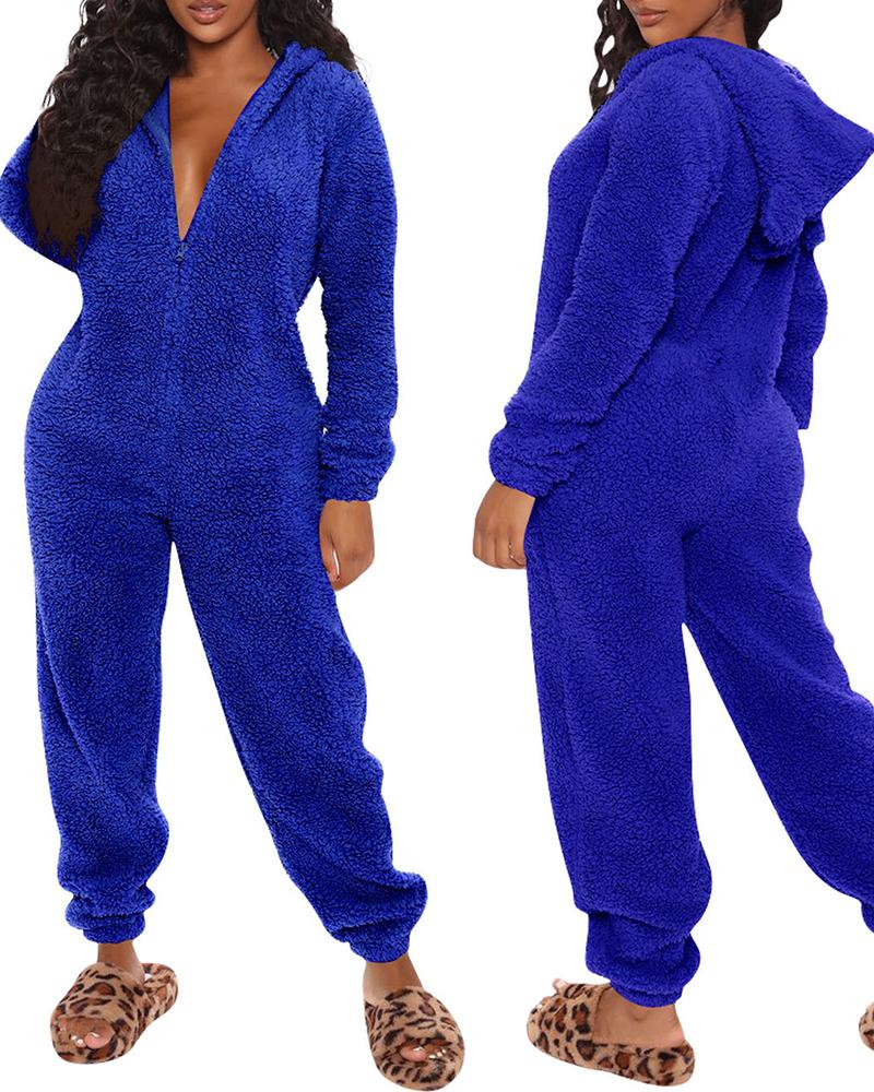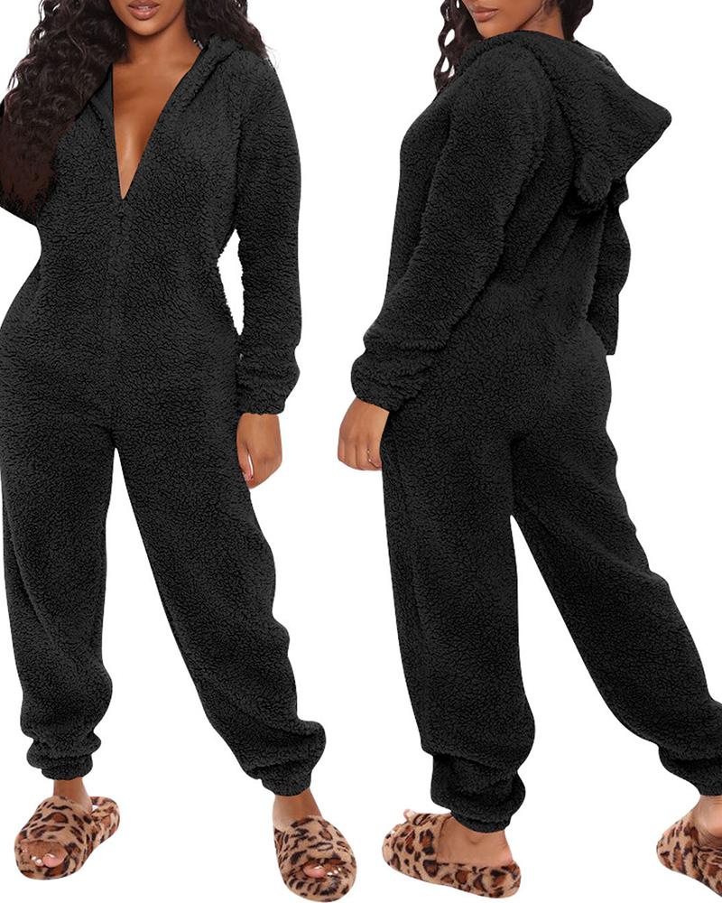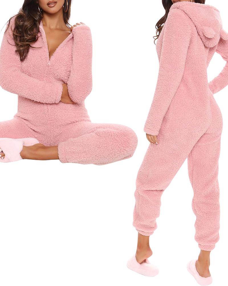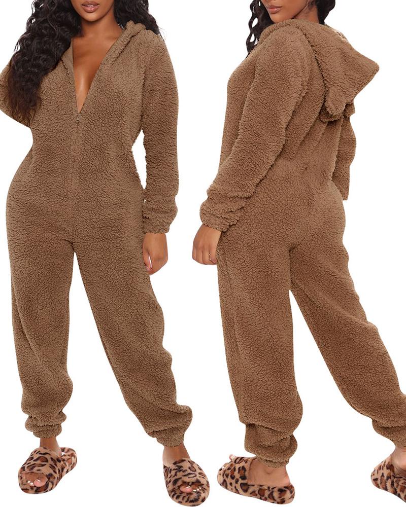 3D Ear Zipper Front Hooded Fluffy Lounge Jumpsuit |