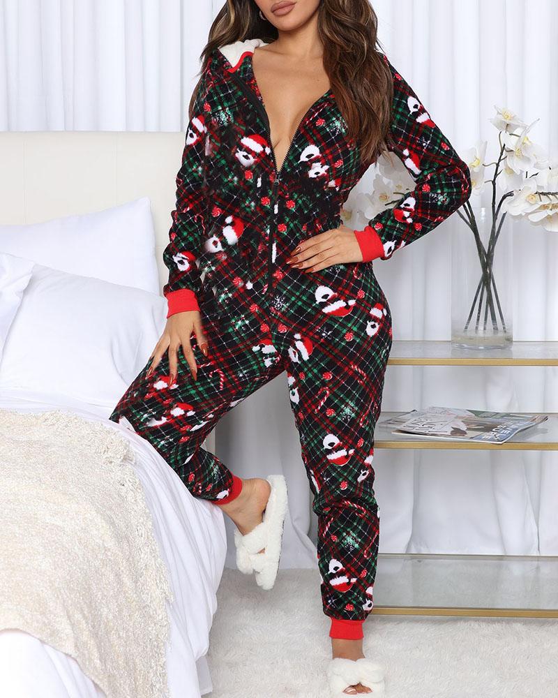 Long Sleeve Plaid Print Hooded Lounge Jumpsuit |