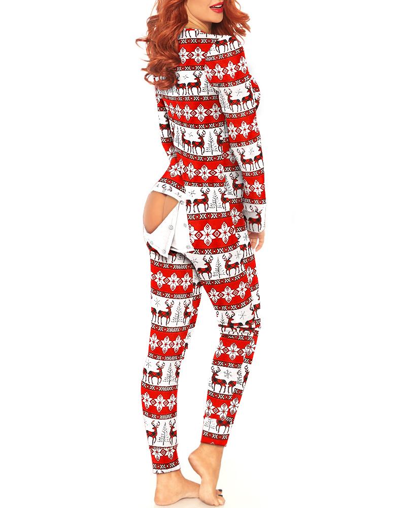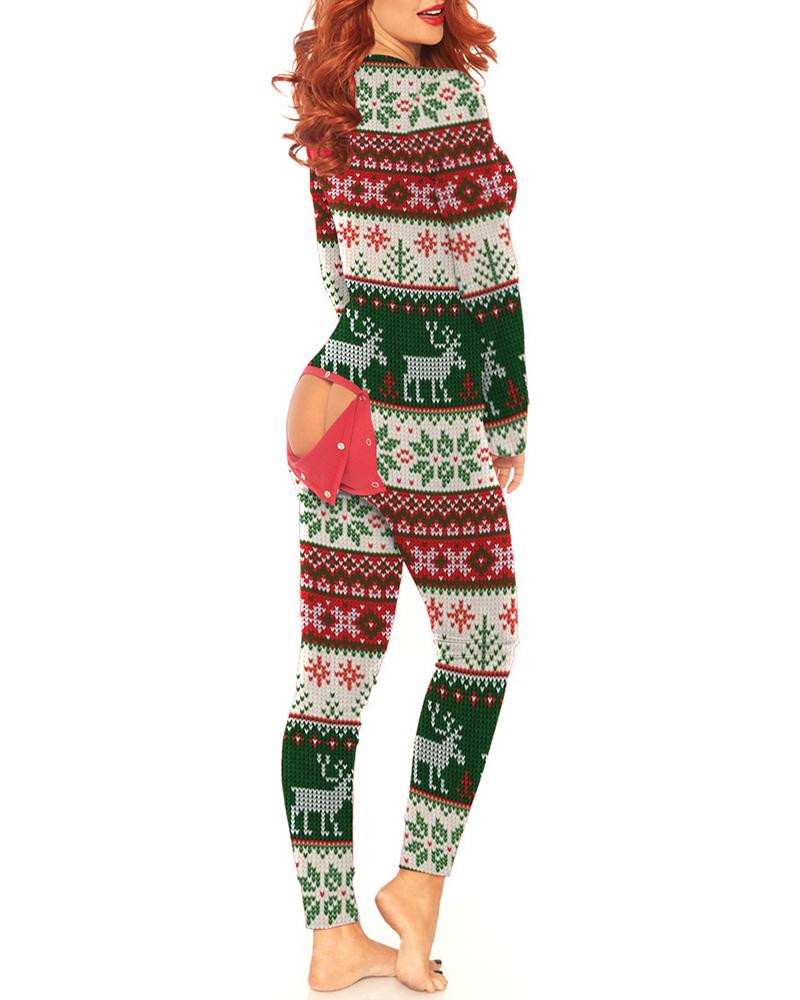 Christmas Print Functional Buttoned Flap Adults Onesie |