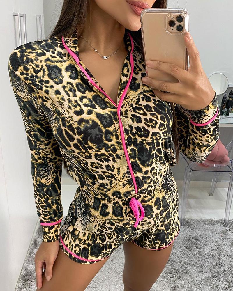 Cheetah Print Contrast Binding Drawstring Pajamas Set |