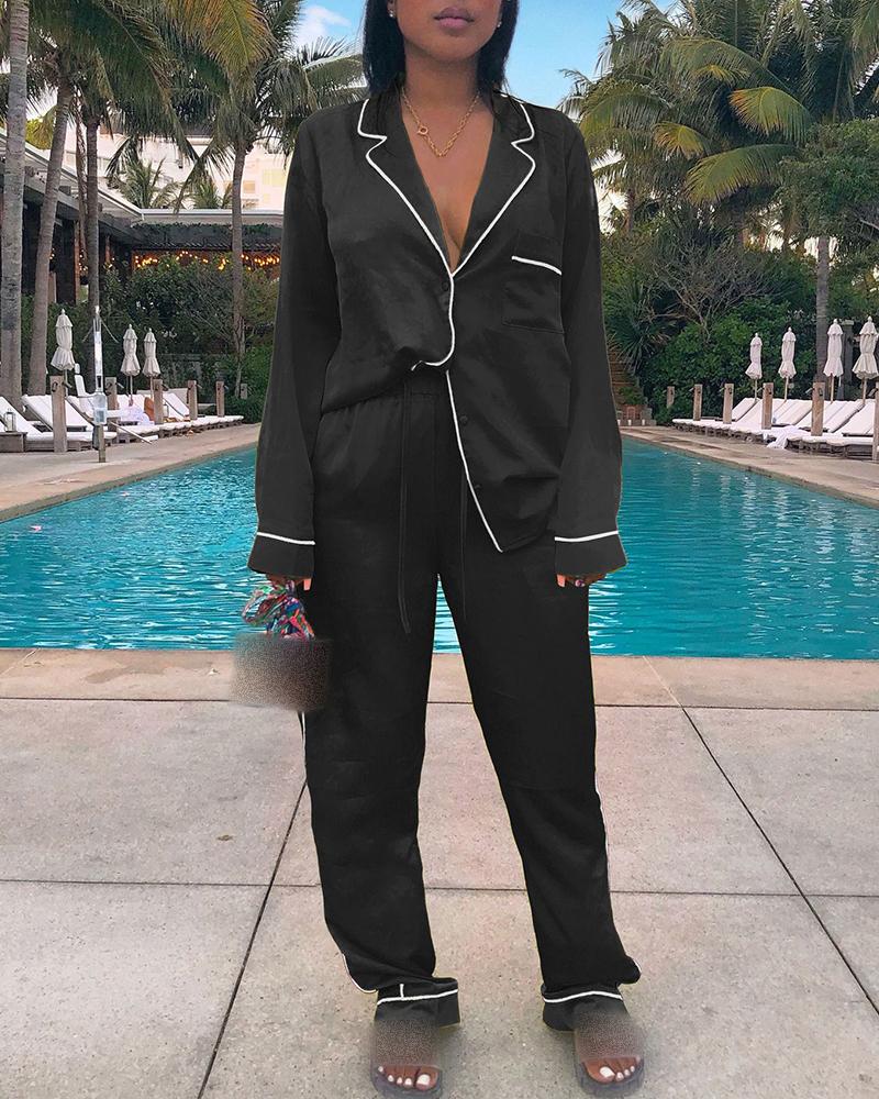 Satin Contrast Biding Pocket Design Top & Drawstring Pants Set |