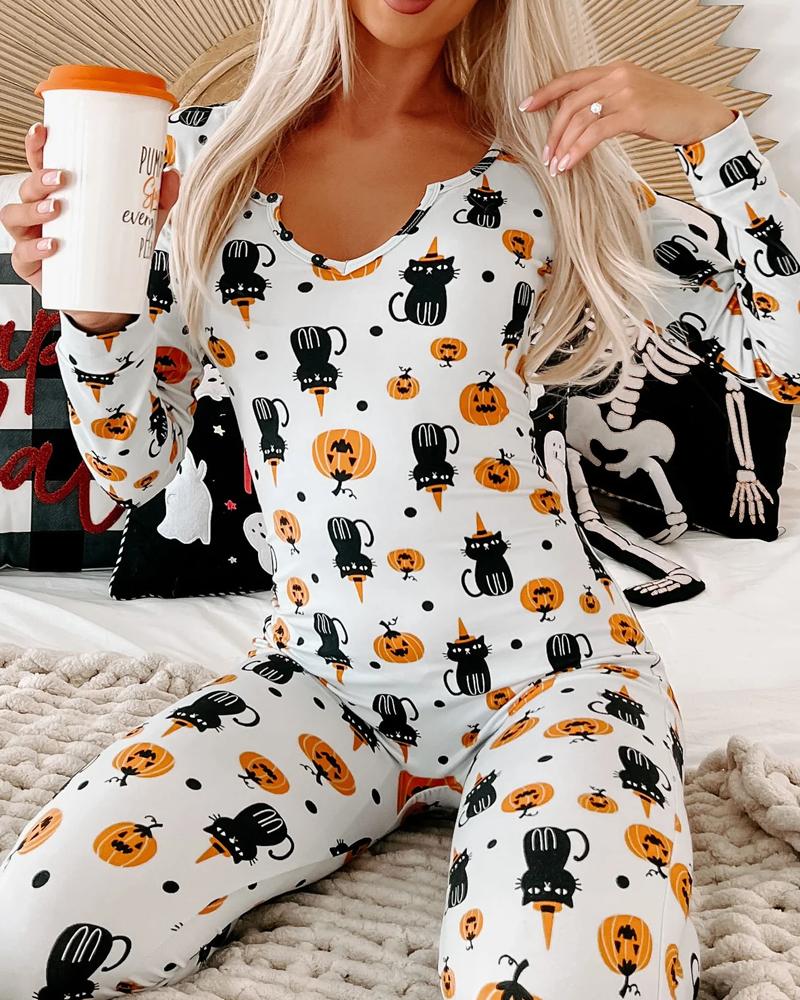 Halloween Pumpkin Print Button Front Lounge Romper |