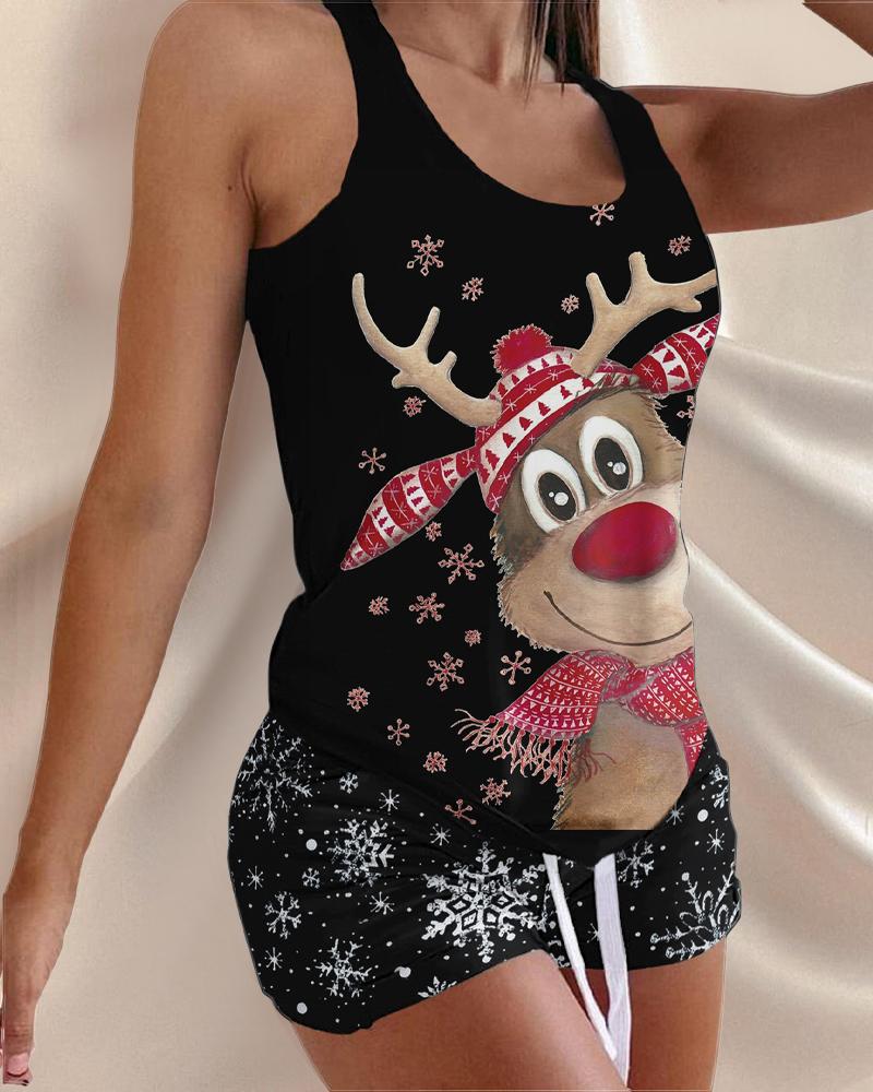 Christmas Snowflake Elk Print Drawstring Pajamas Set |
