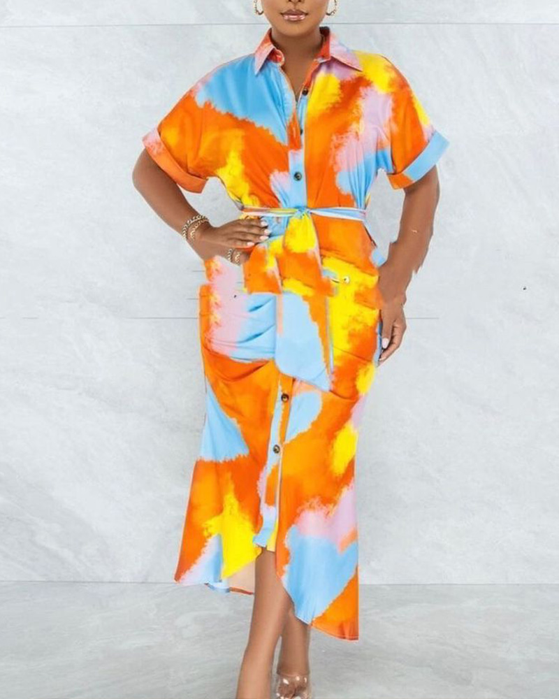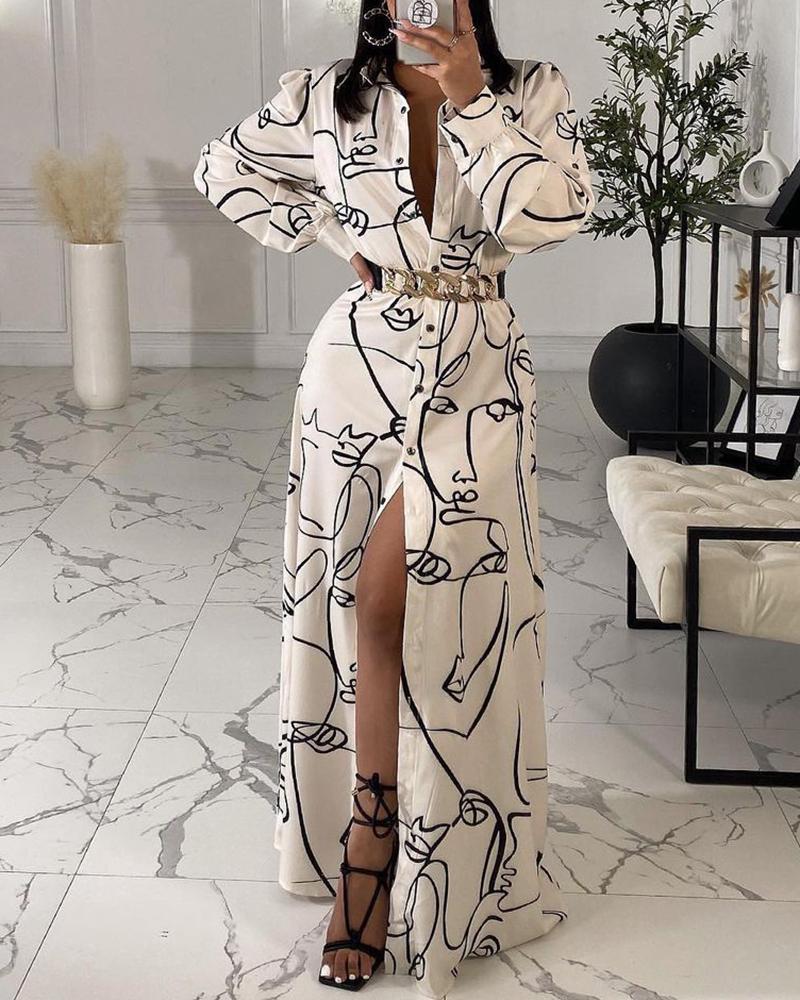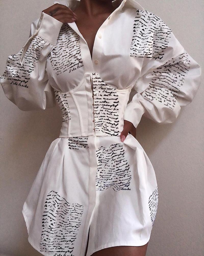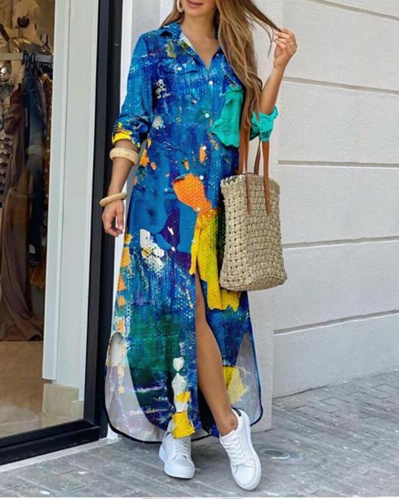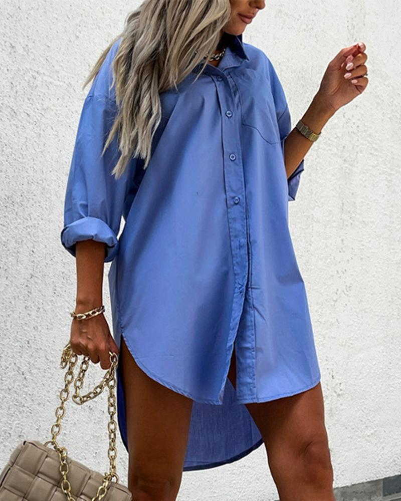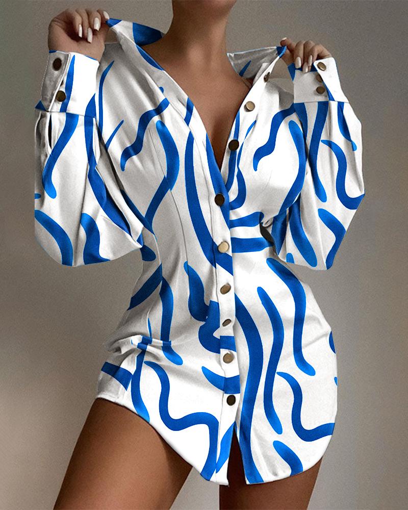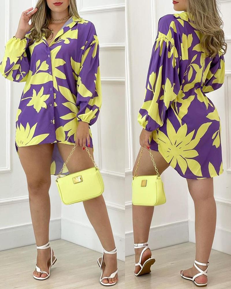 All Over Print Button Front Curved Hem Long Shirt Dress |