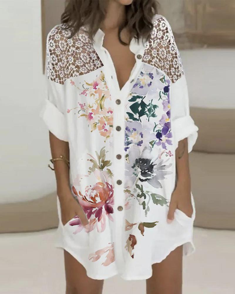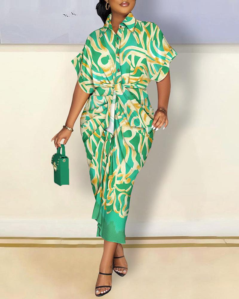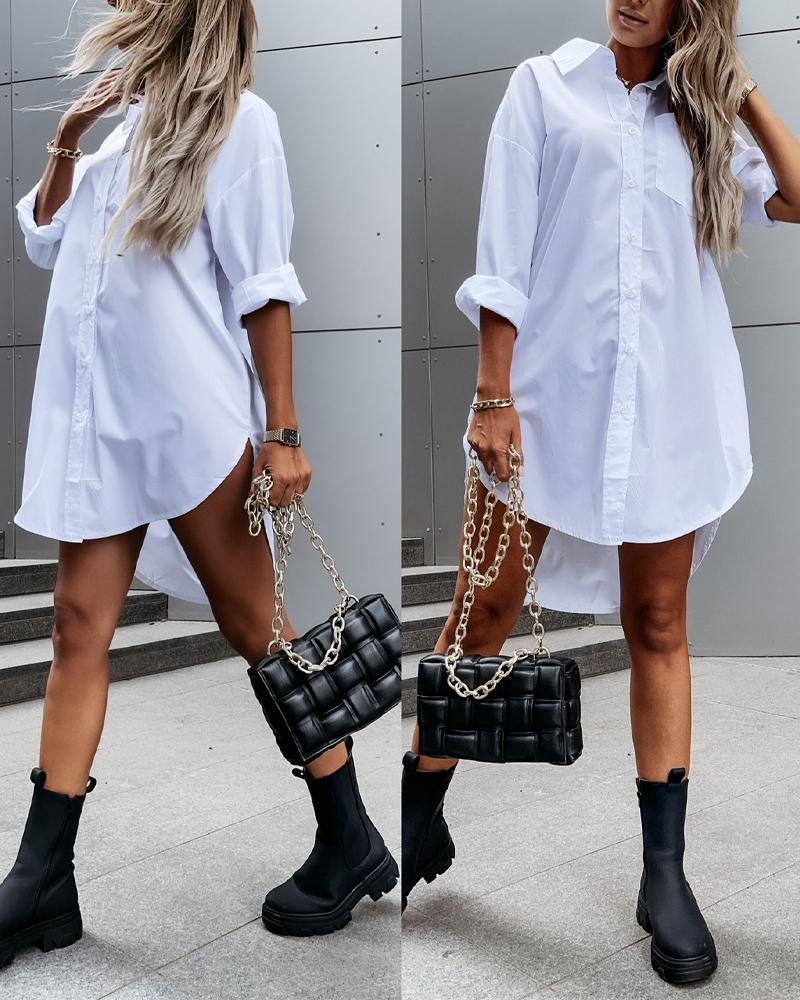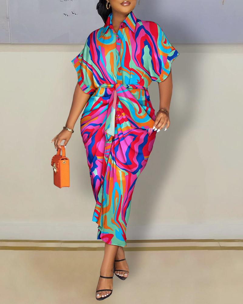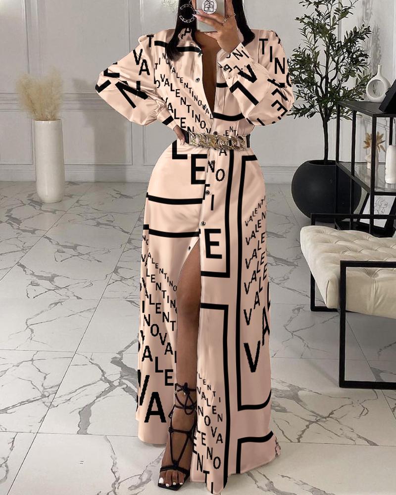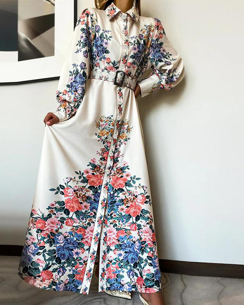 All Over Print Button Front Curved Hem Long Shirt Dress |