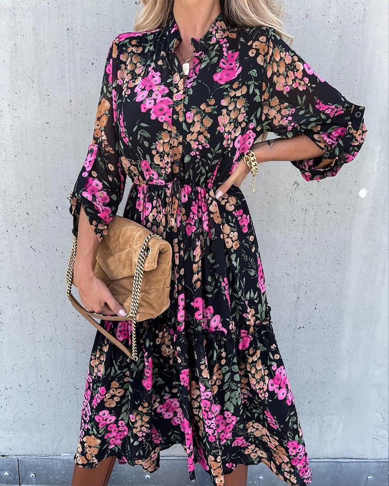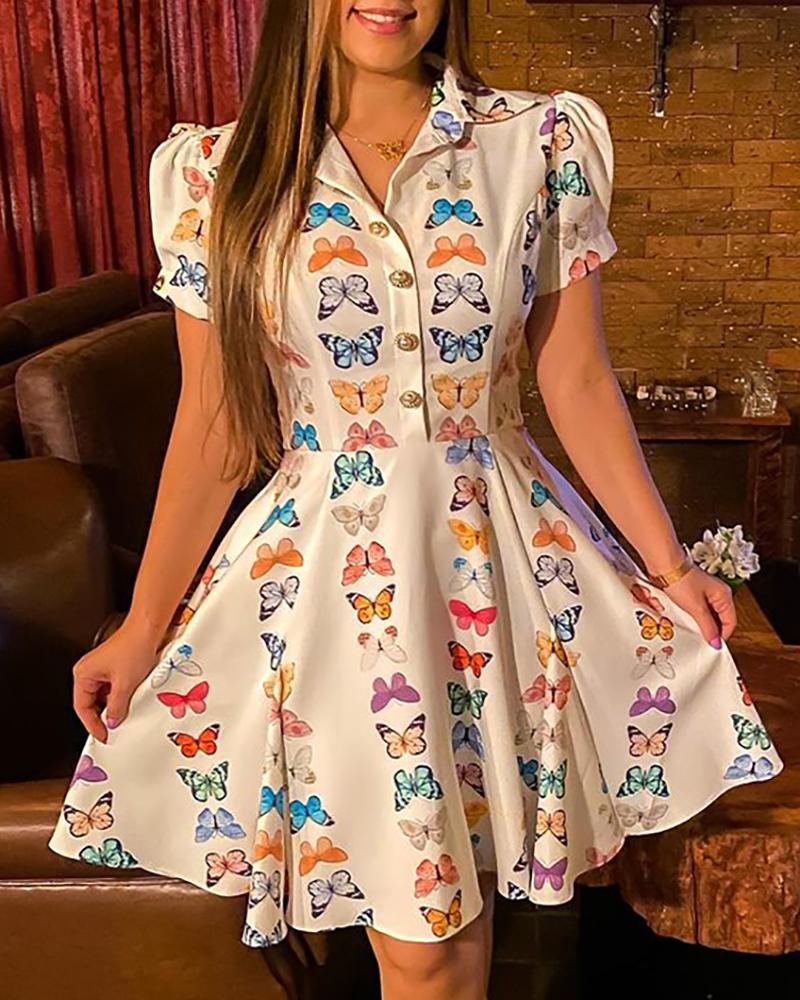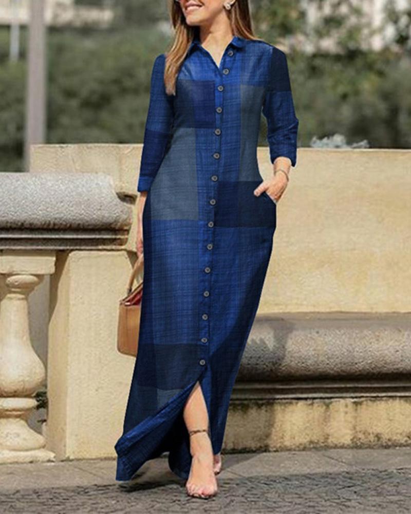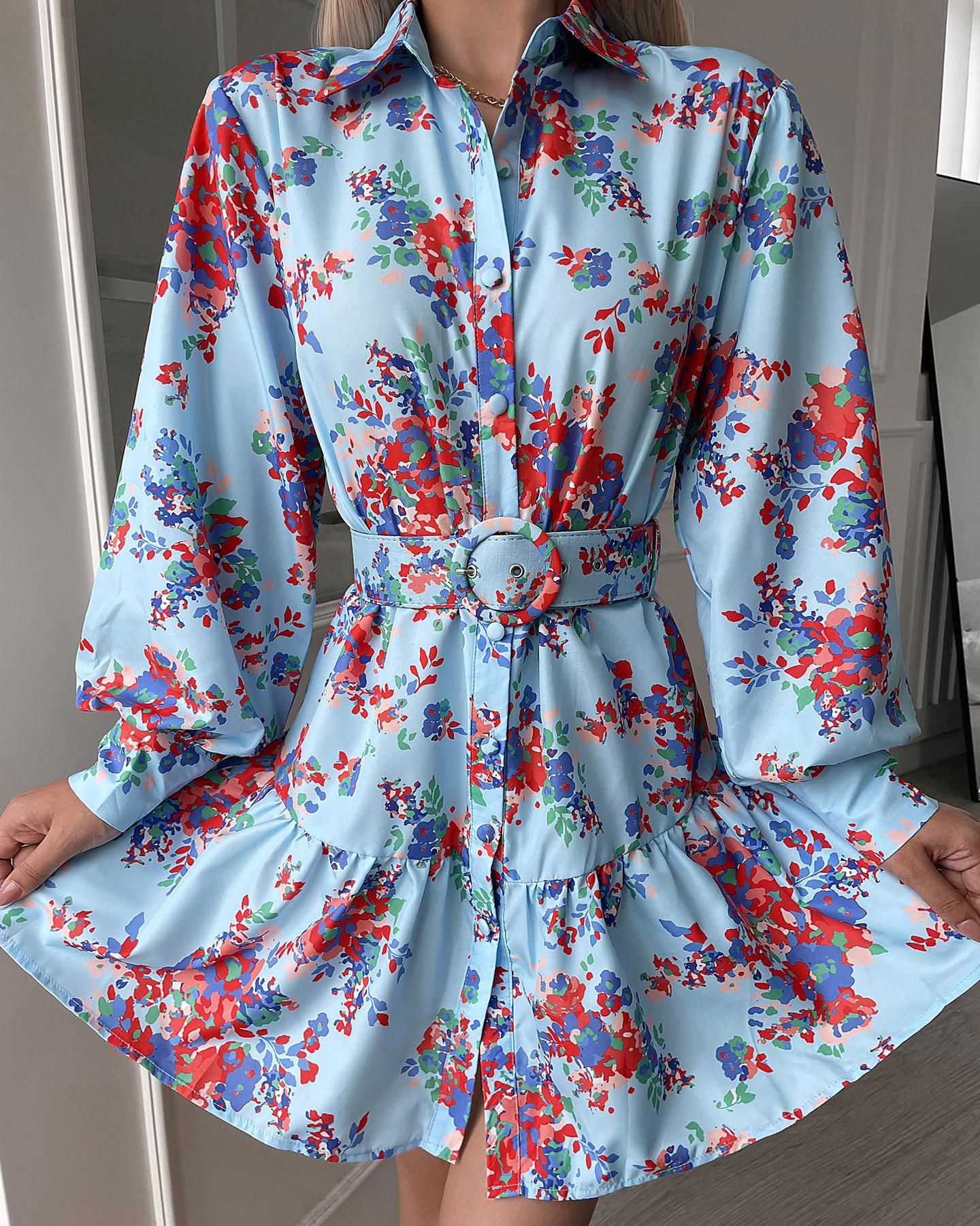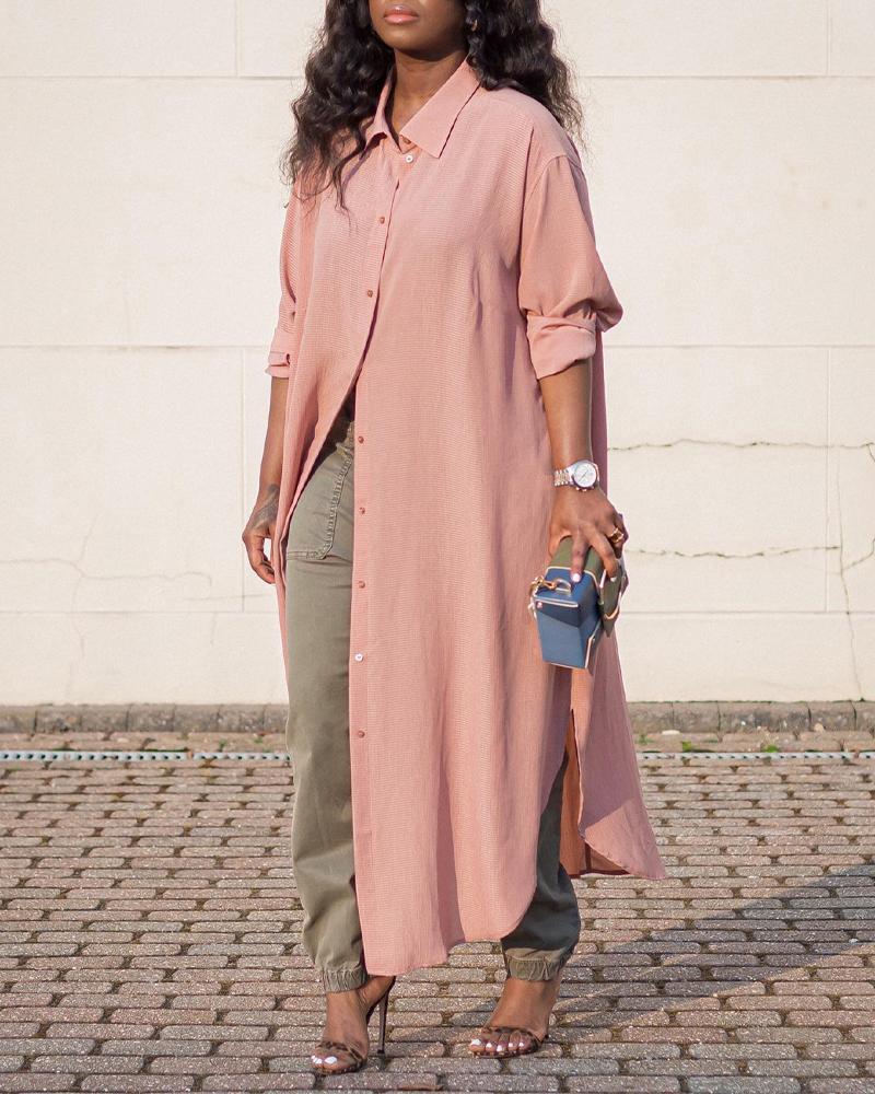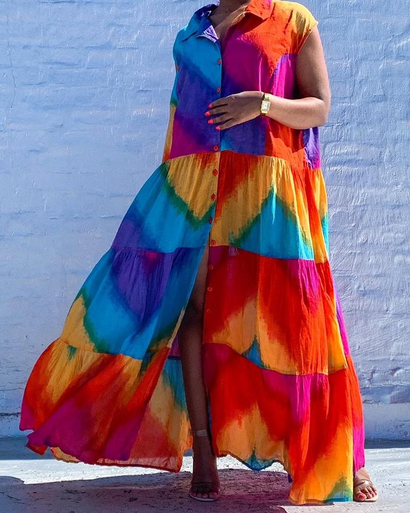 All Over Print Button Front Curved Hem Long Shirt Dress |