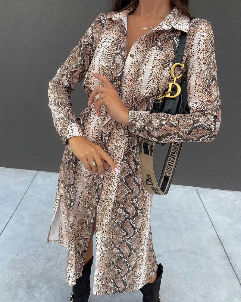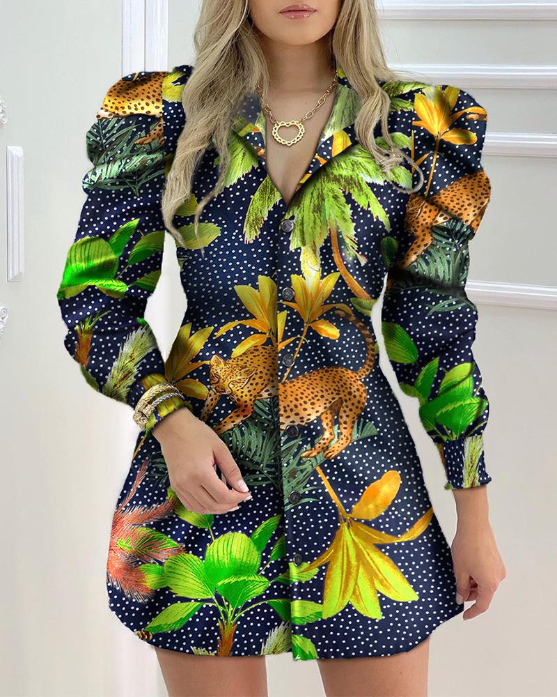 Floral Animal Print Button Design Sides Slit Shirt Dress |