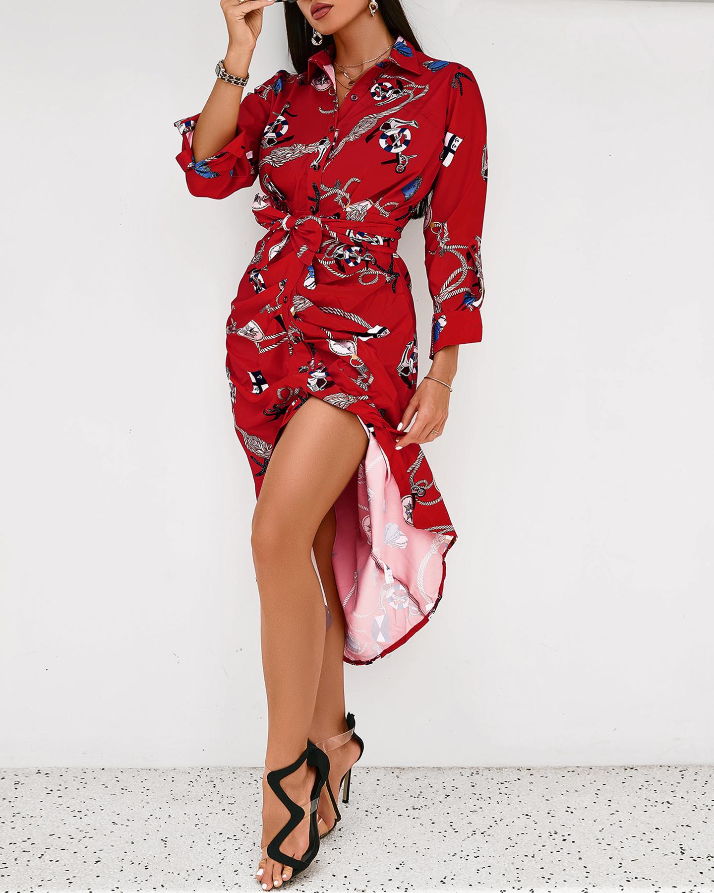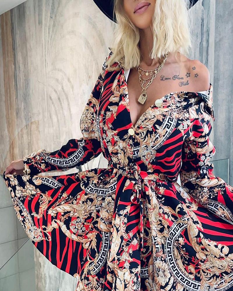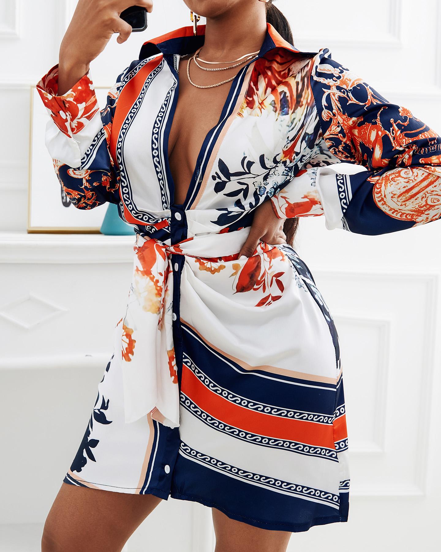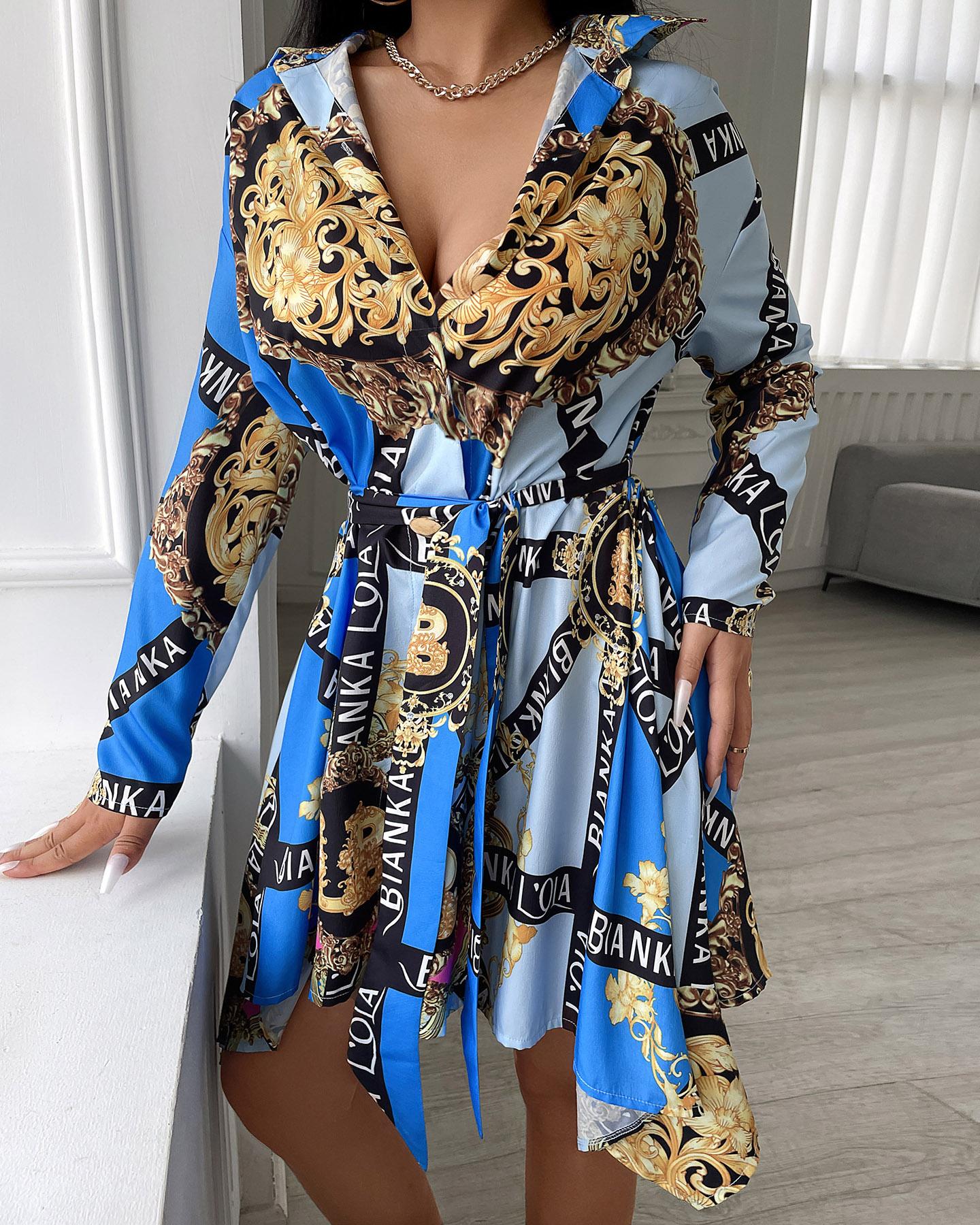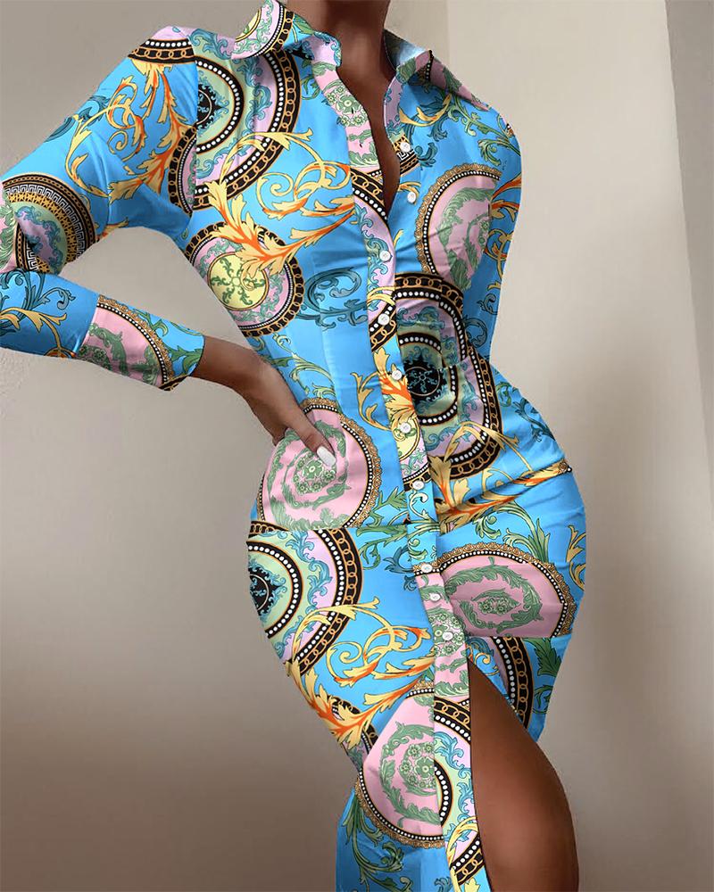 Baroque Print Long Sleeve Button Down Shirt Dress |