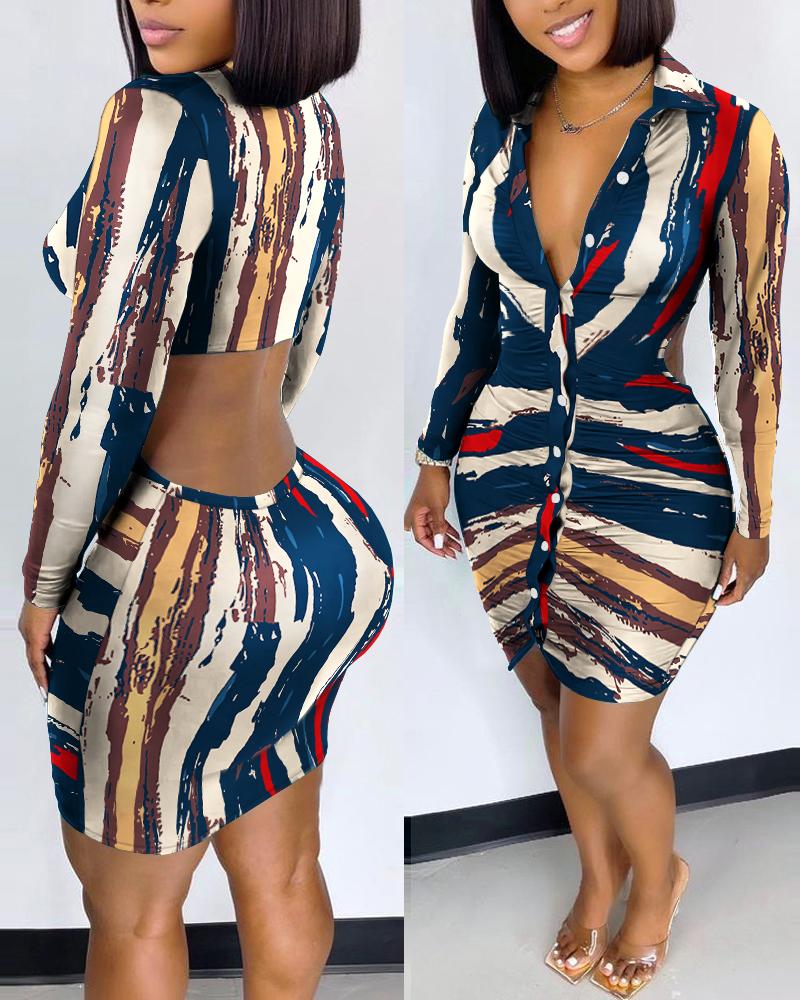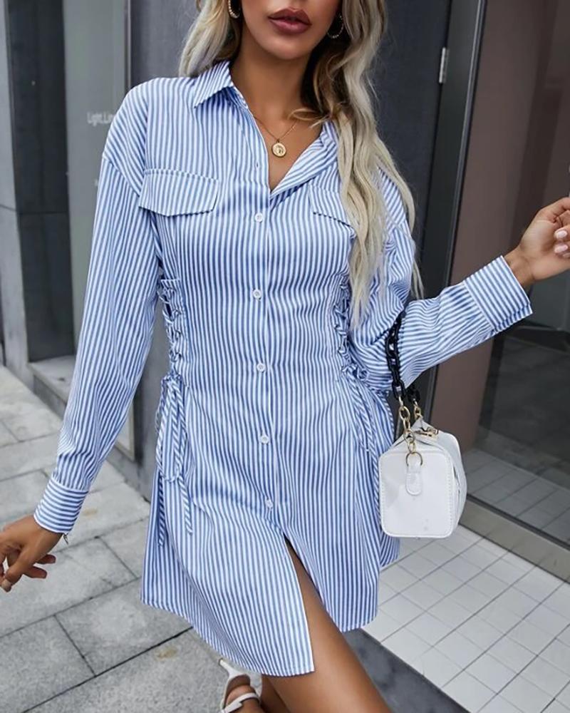 Striped Print Roll Up Sleeve Ruched Shirt Dress |
