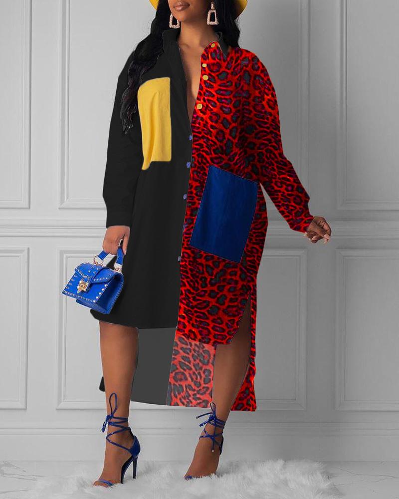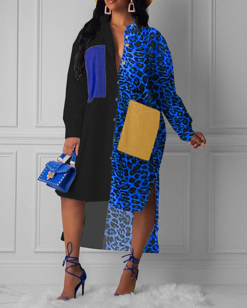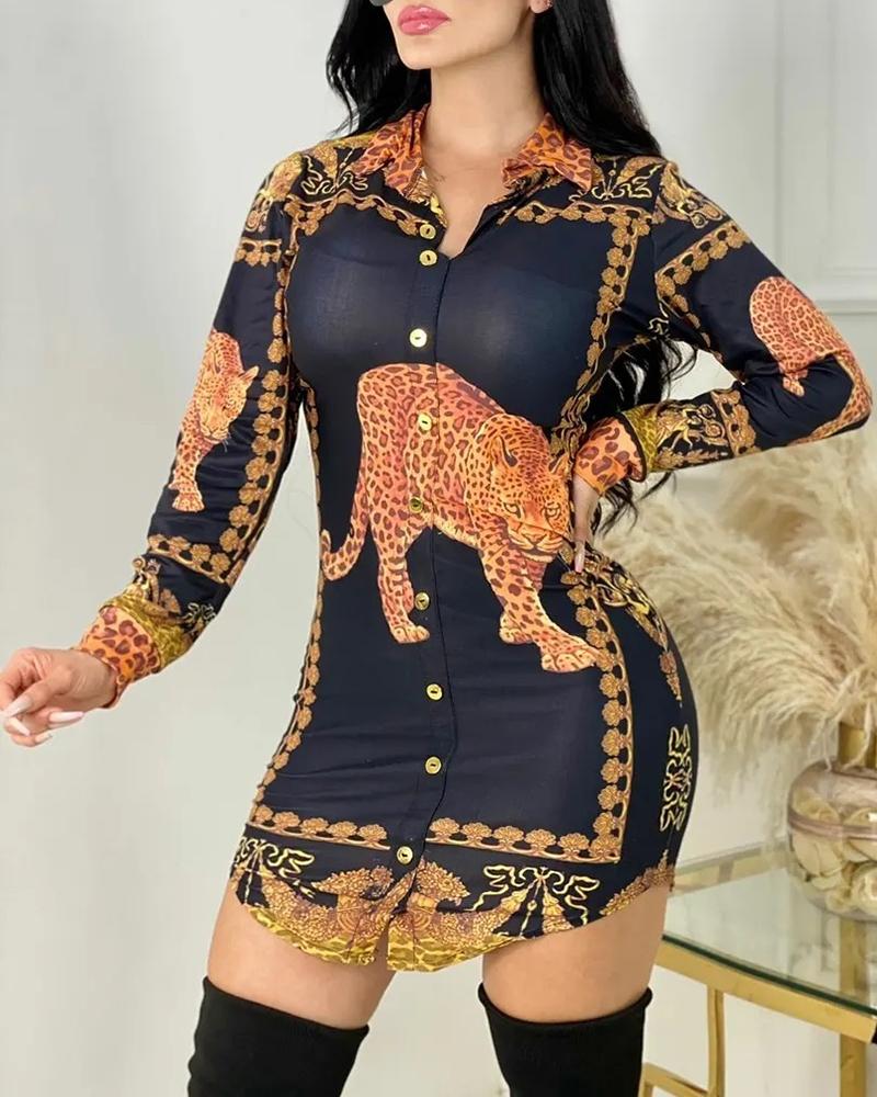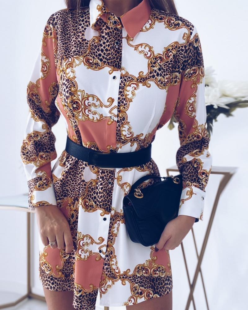 Leopard Chain Print Buttoned Pocket Design Shirt Dress |