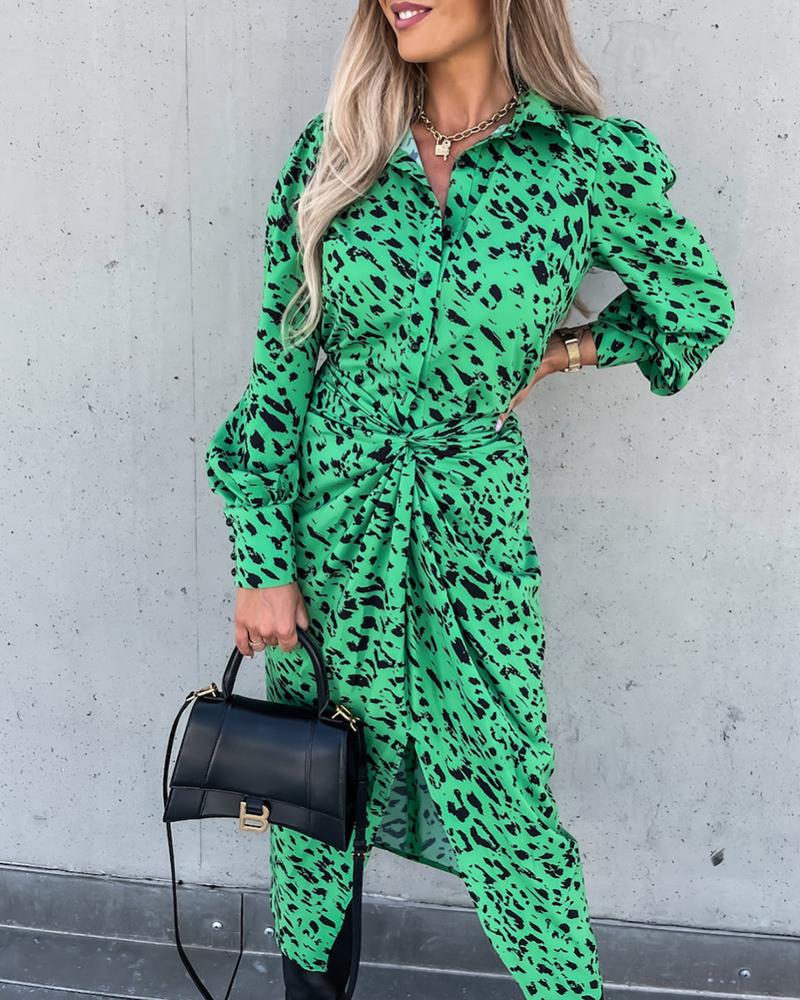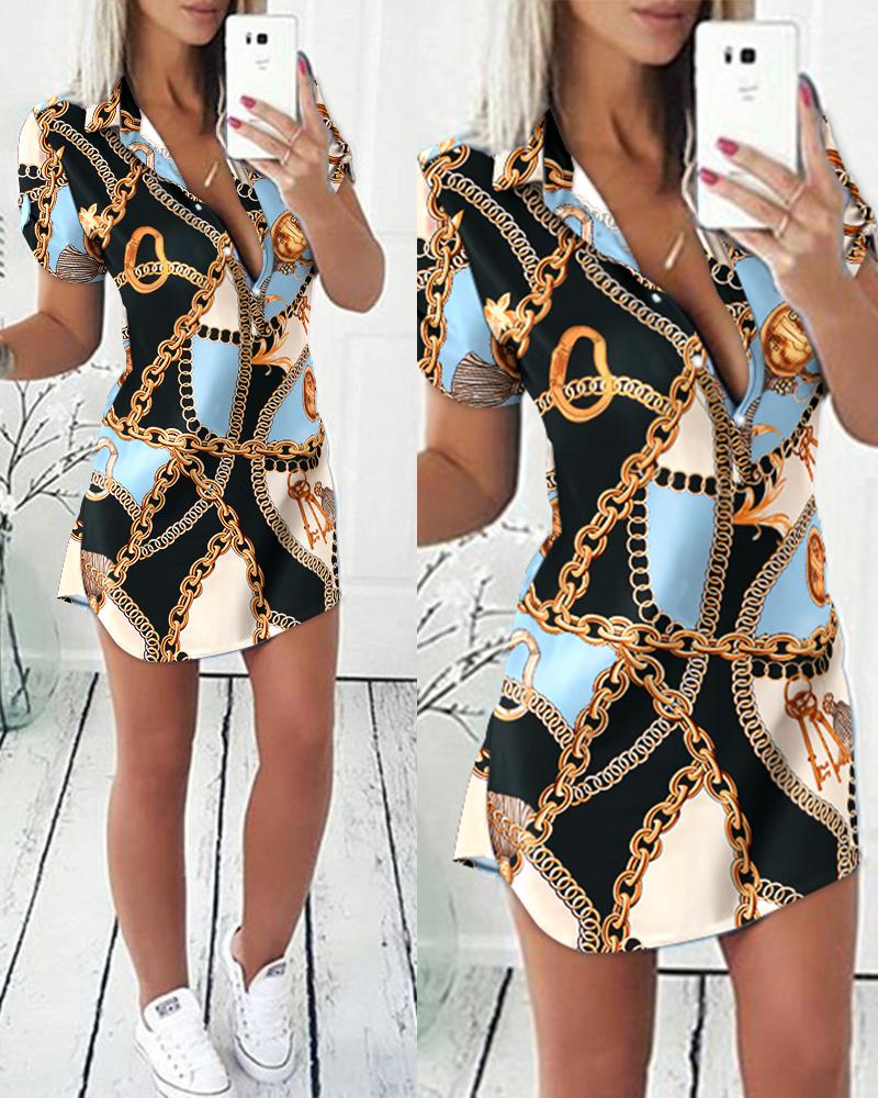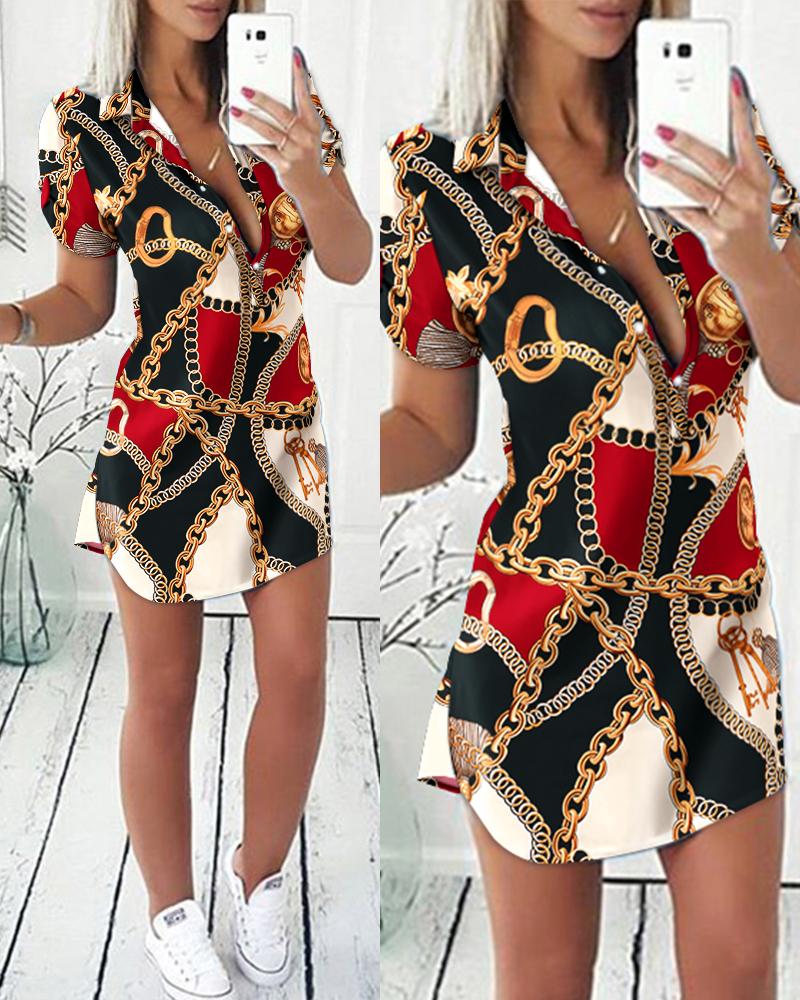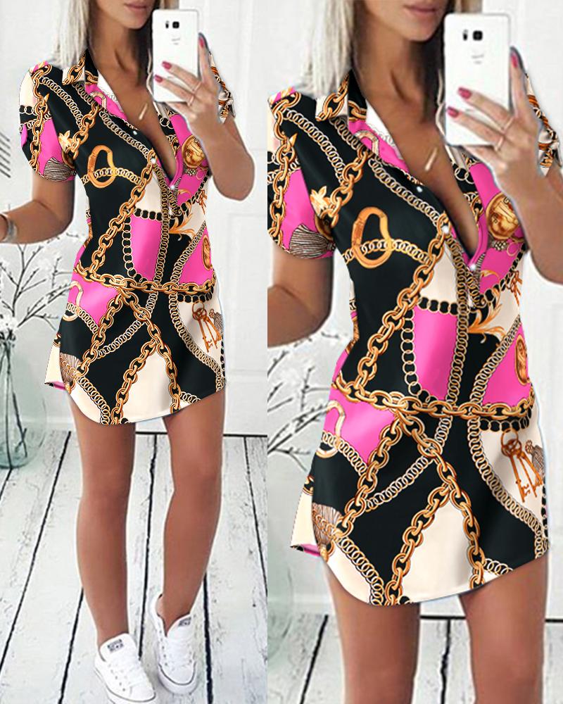 Leopard Chain Print Buttoned Pocket Design Shirt Dress |