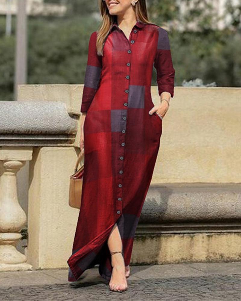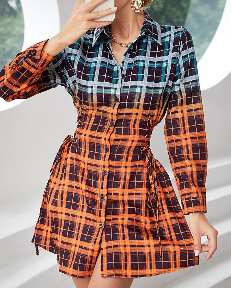 Plaid Print Lace-Up Front Slit Shirt Dress |