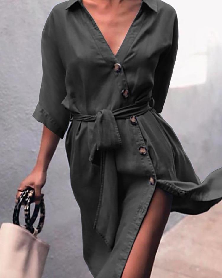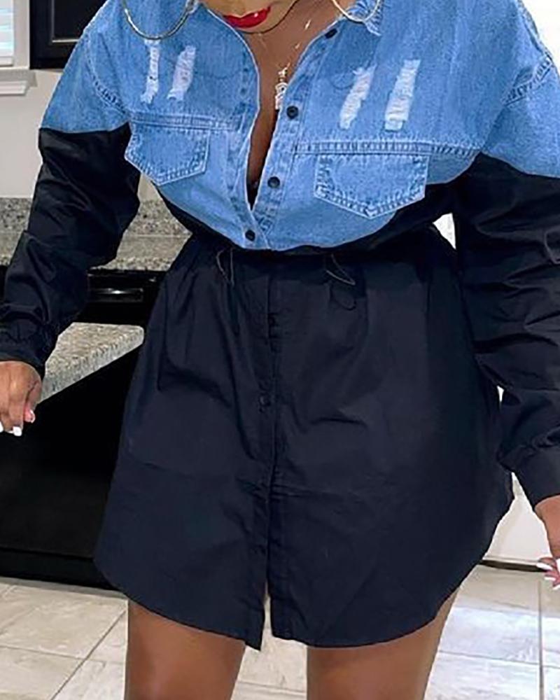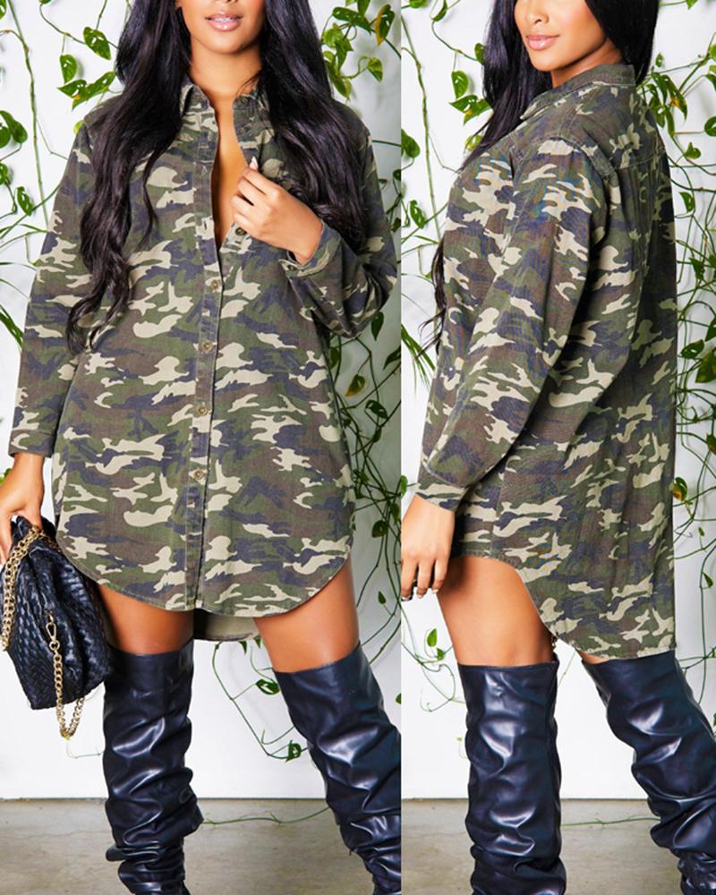 Camouflage Denim Buttoned Slit Shirt Dress |