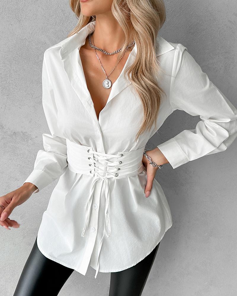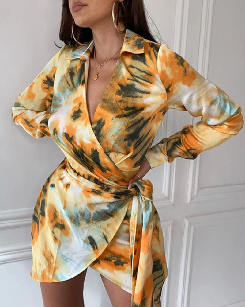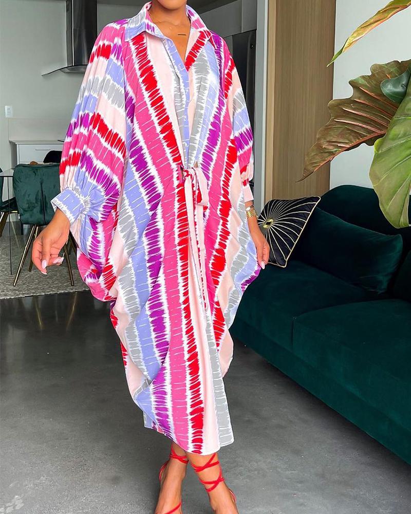 Geometric Print Lace-up Front Long Sleeve Shirt Dress |