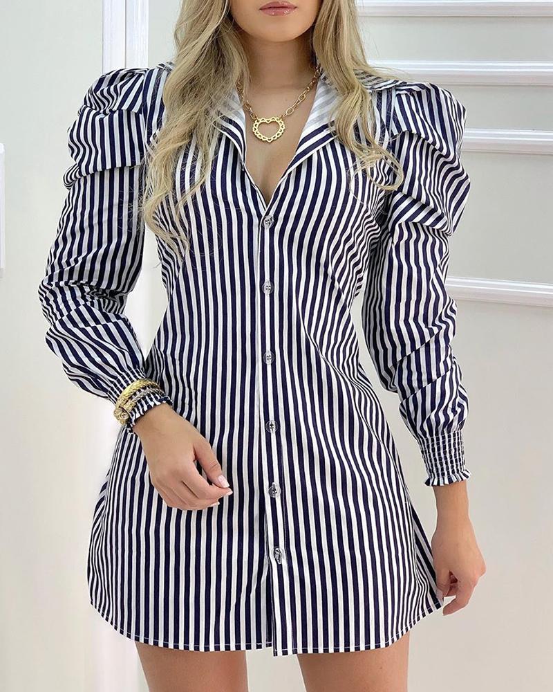 Striped Print Colorblock Puff Sleeve Shirt Dress |