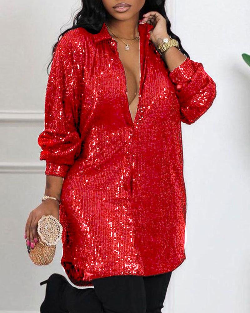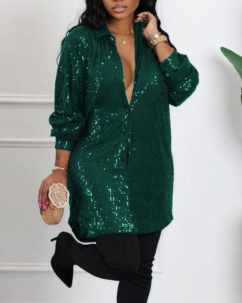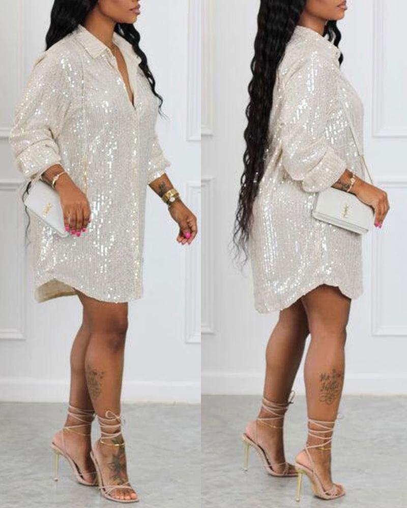 Plus Size Long Sleeve Allover Sequin Shirt Dress |