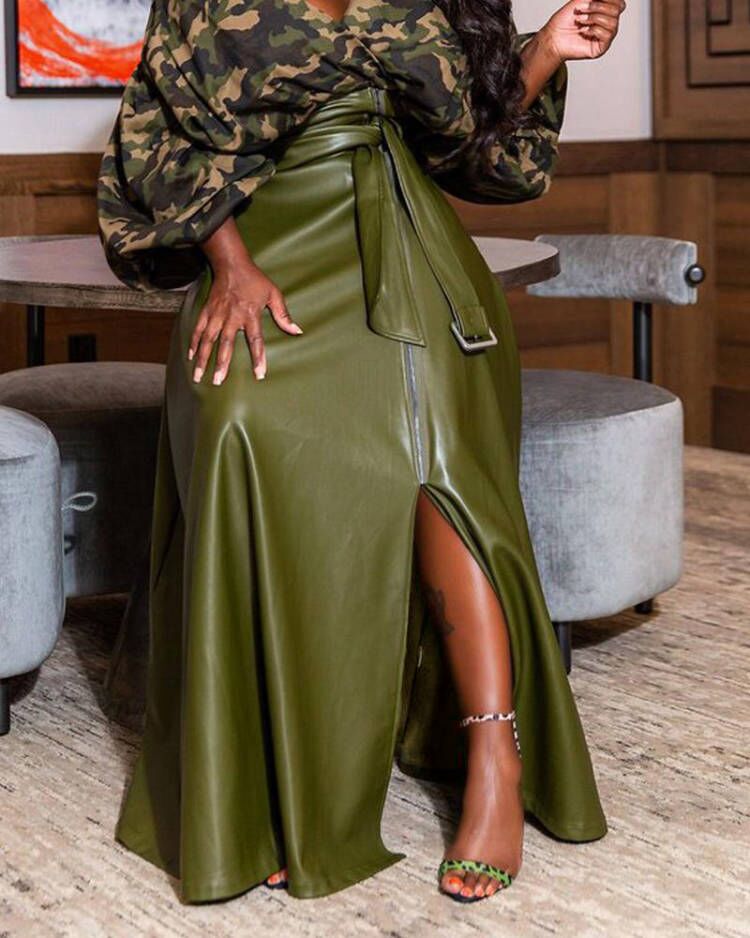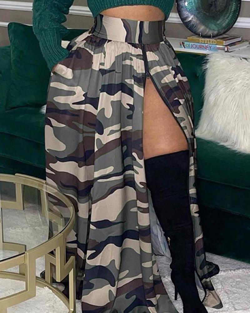 Camouflage Print Zipper Design Ruched Maxi Skirt |