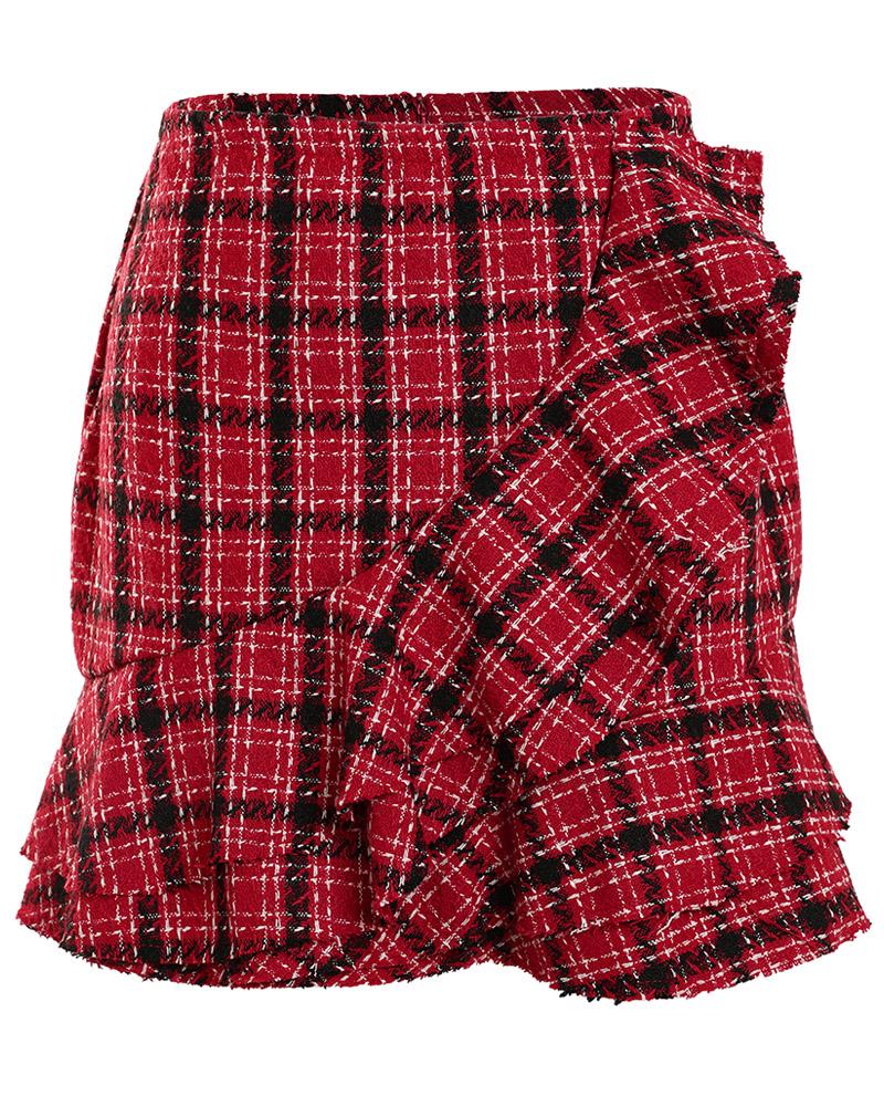 Tweed Ruffles Trim Plaid Print Skirt |