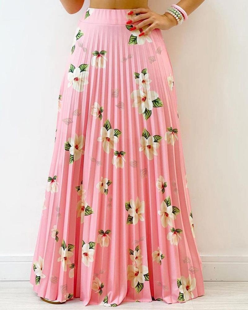 Floral Print High Waist Pleated Maxi Skirt |