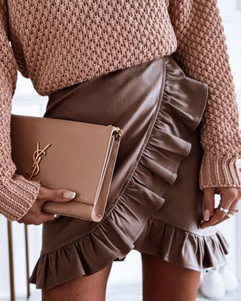 PU Leather Ruffle Hem Mini Skirt |