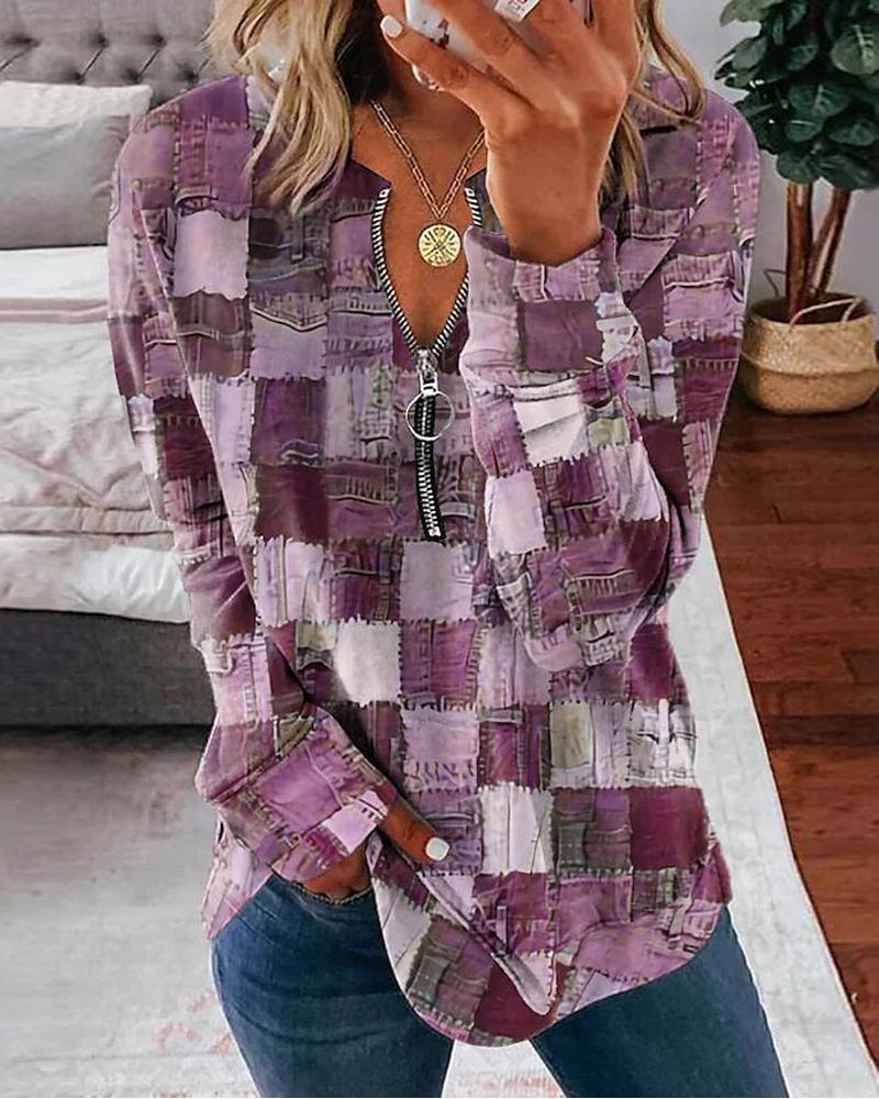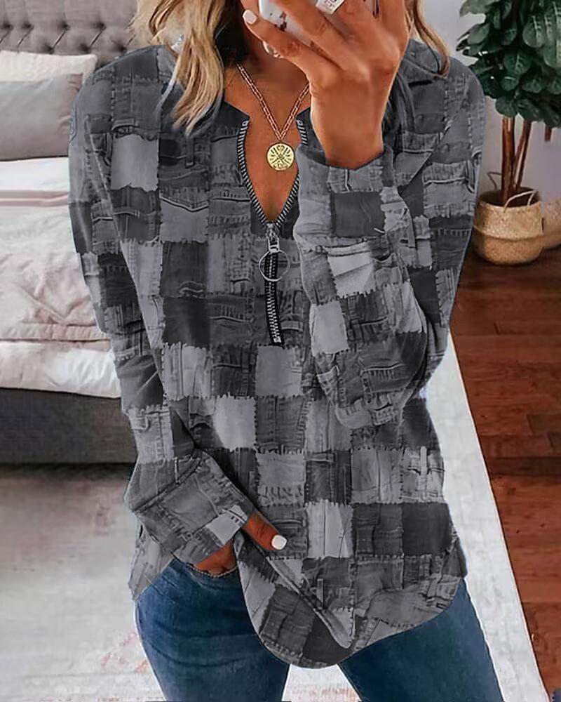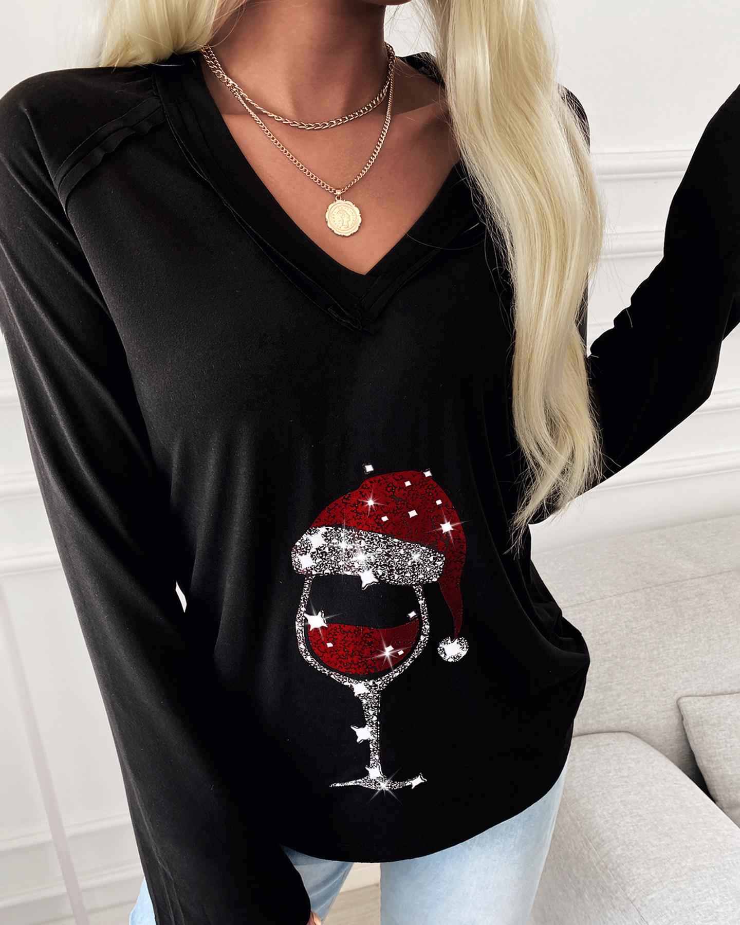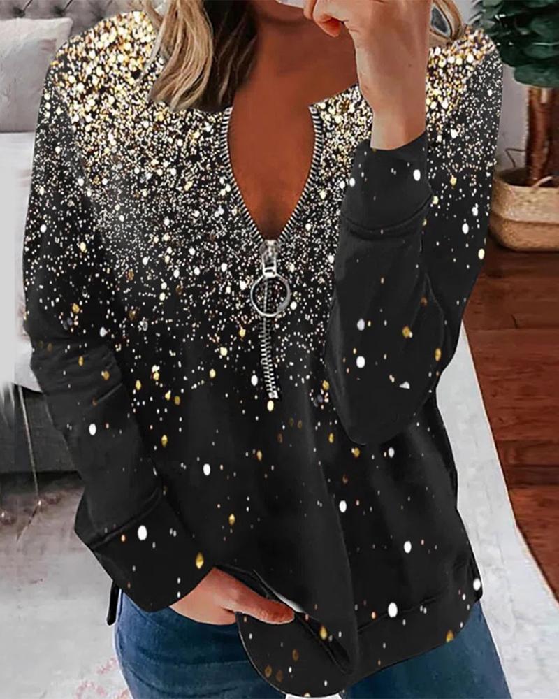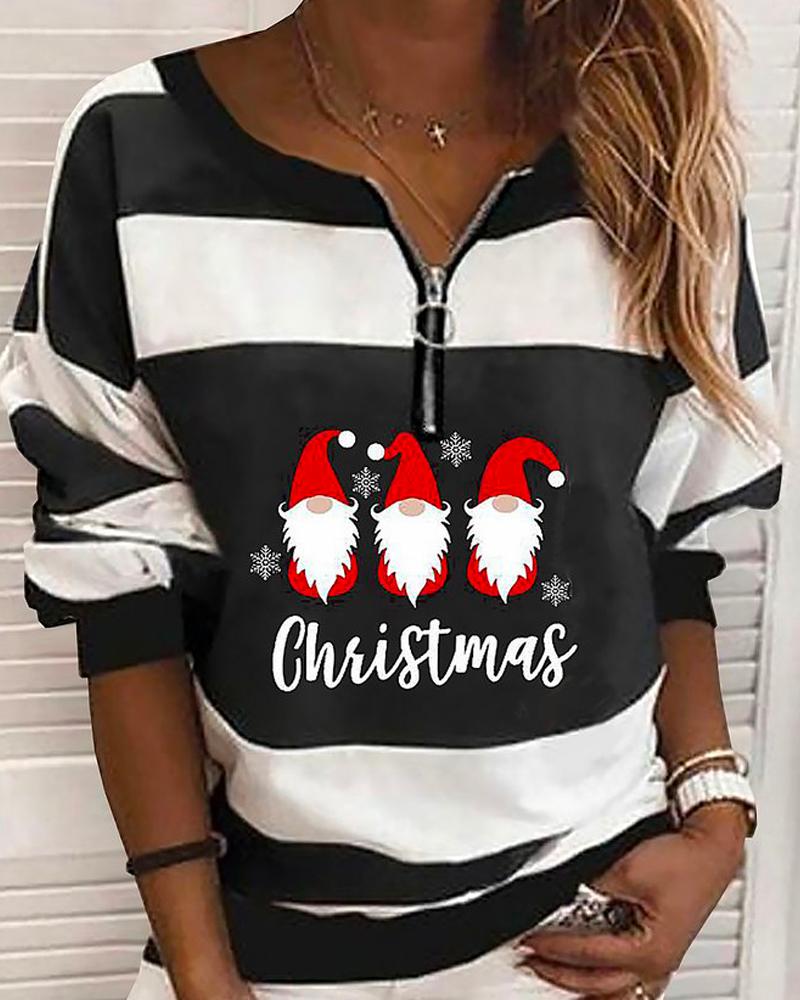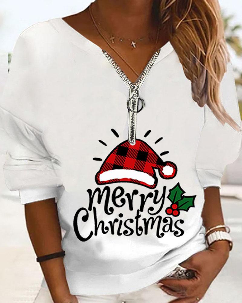 Plus Size Christmas Santa Hat Print Zip Front Casual Top |
