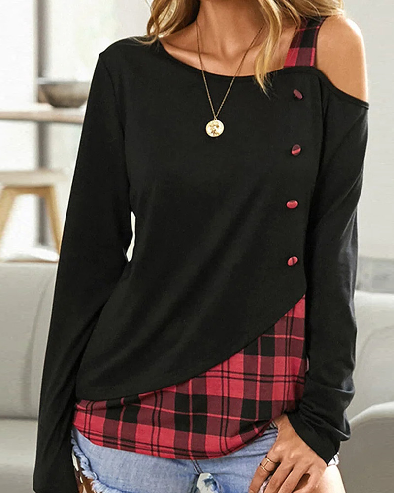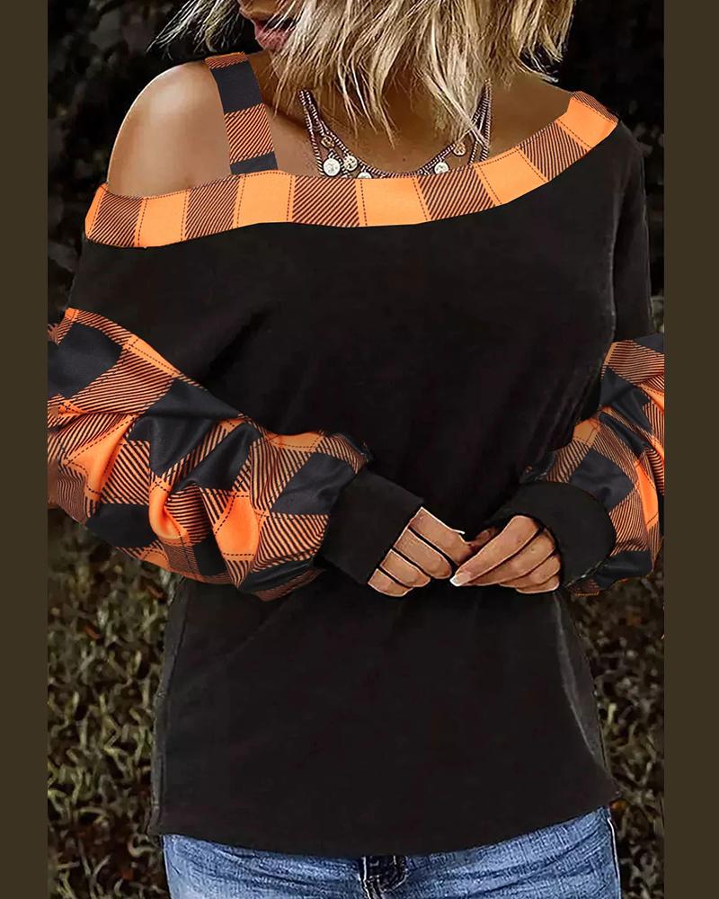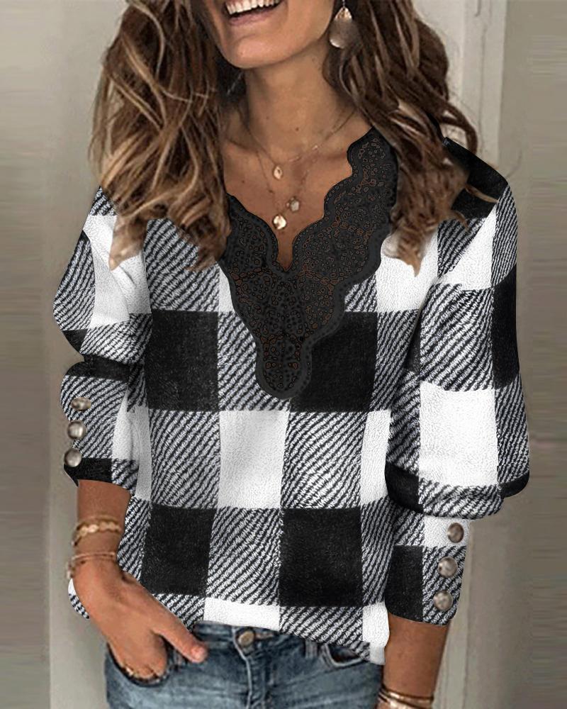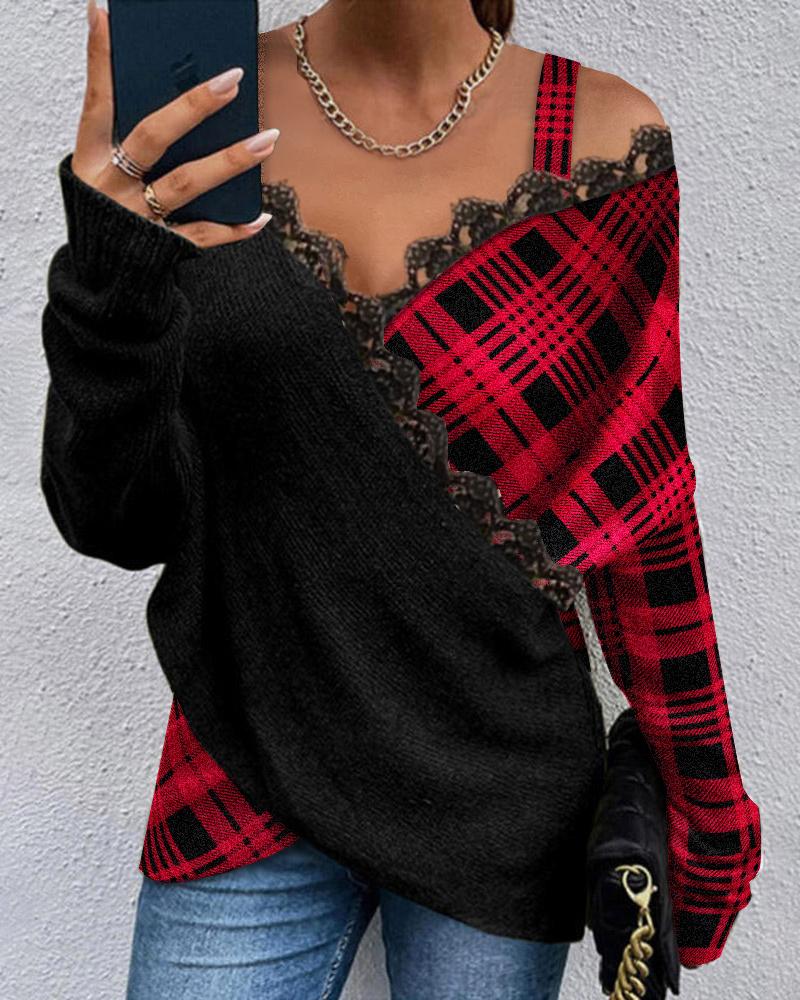Plaid Print Contrast Lace Cold Shoulder Wrap Top |