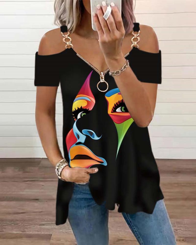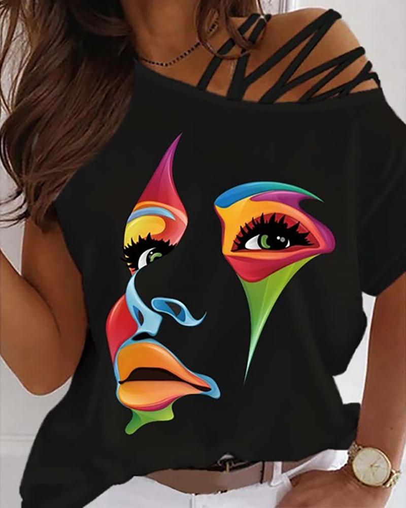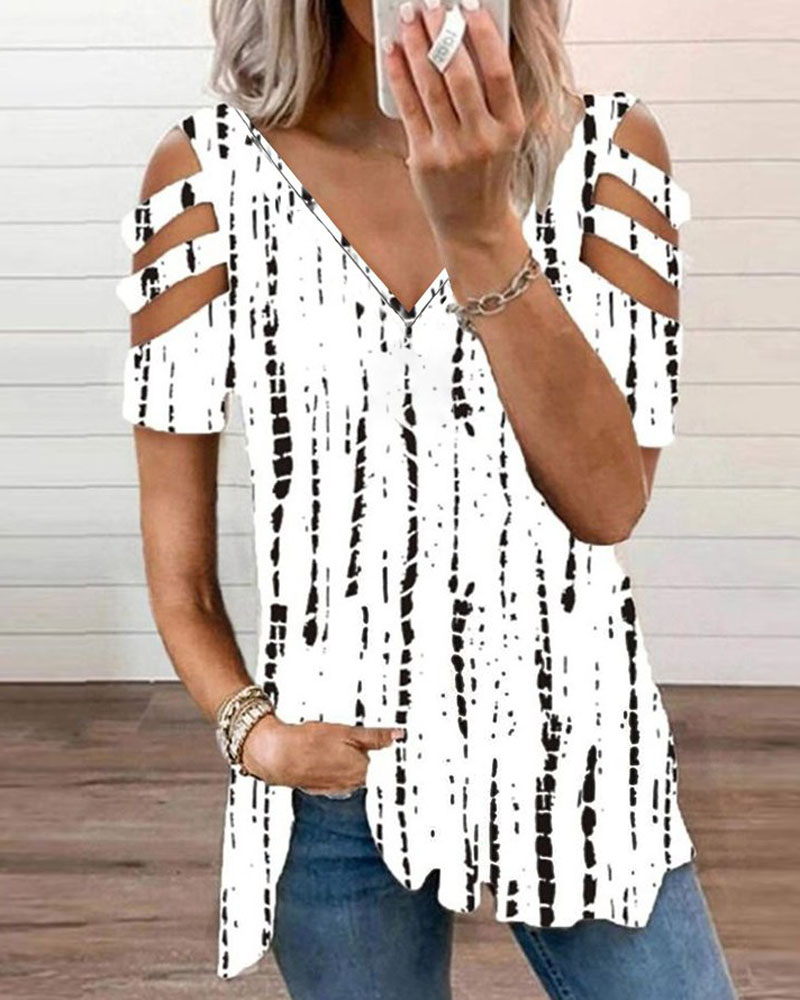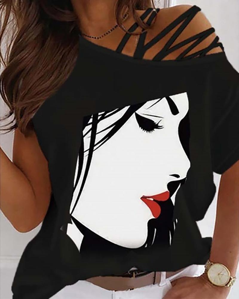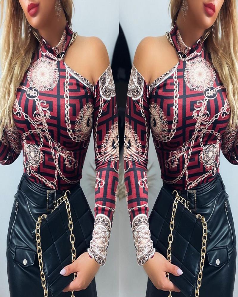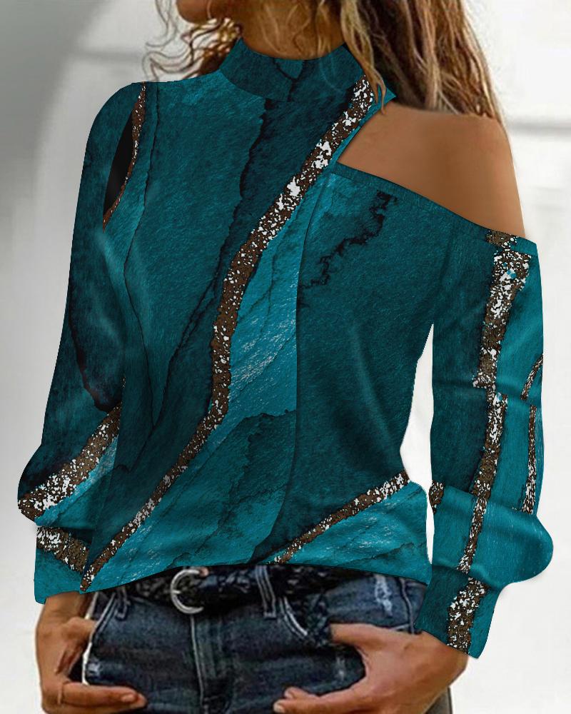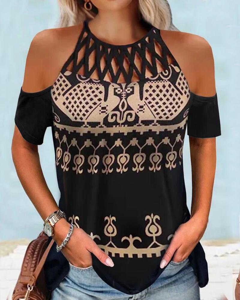 Figure Print Hollow-out Cold Shoulder Top |
