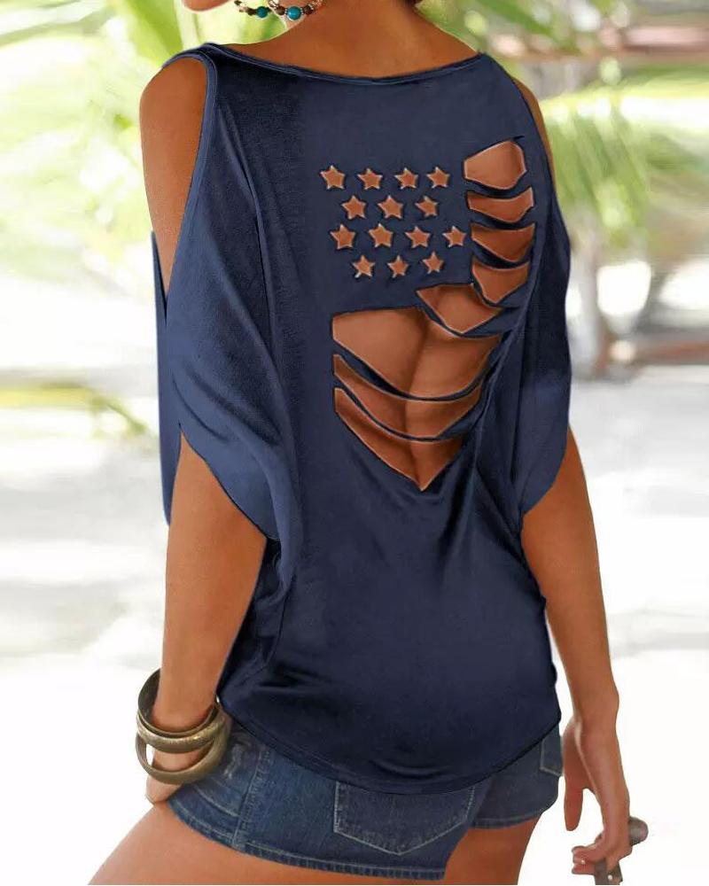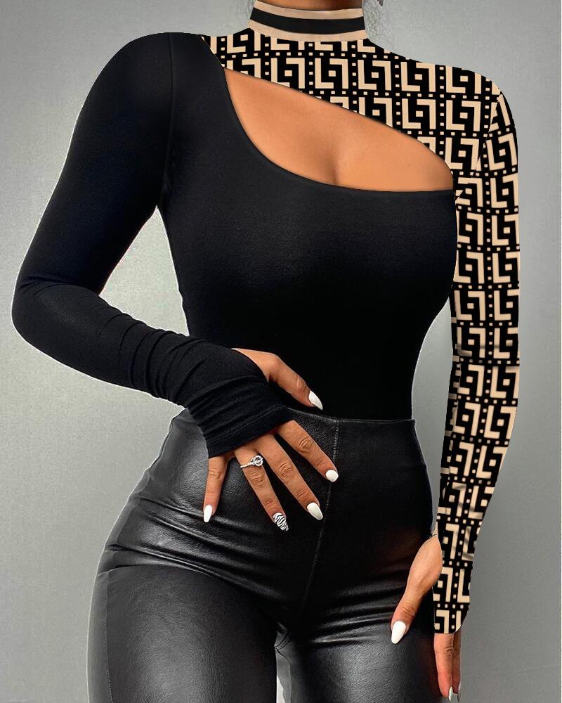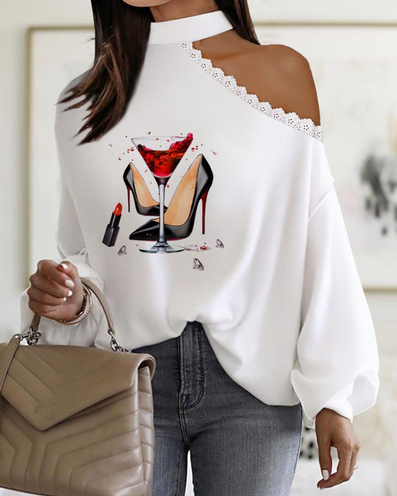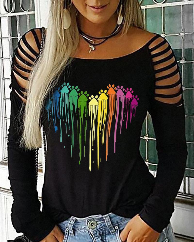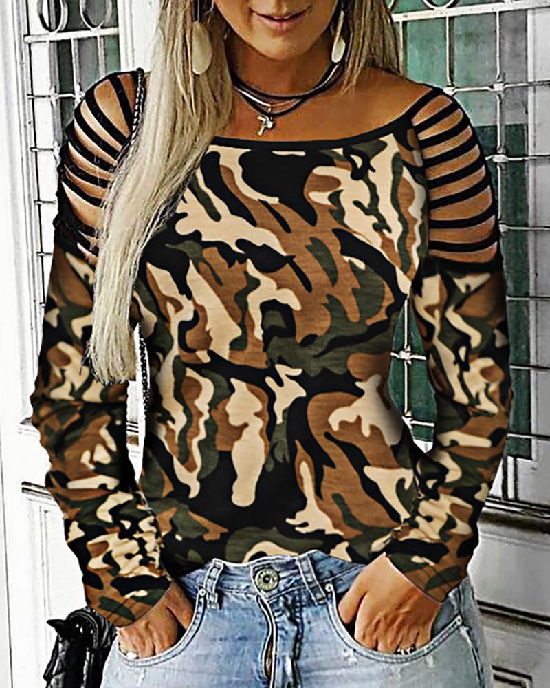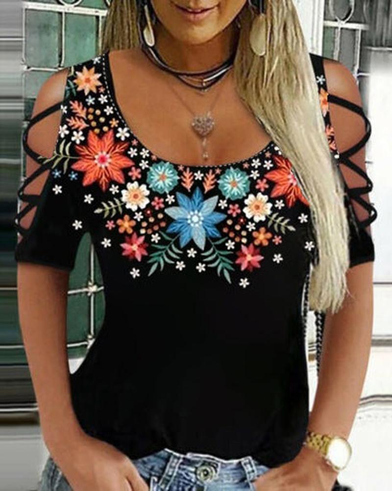 Figure Print Hollow-out Cold Shoulder Top |