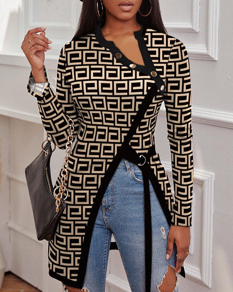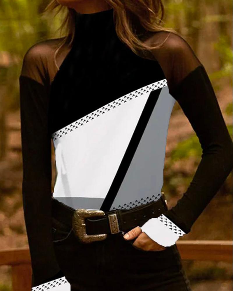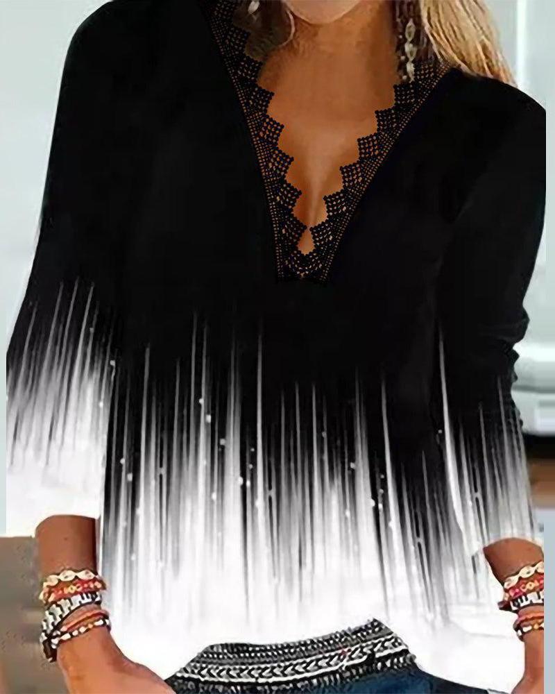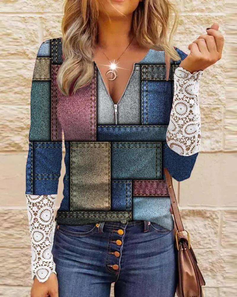 Geo Print Colorblock Contrast Lace Long Sleeve Top |