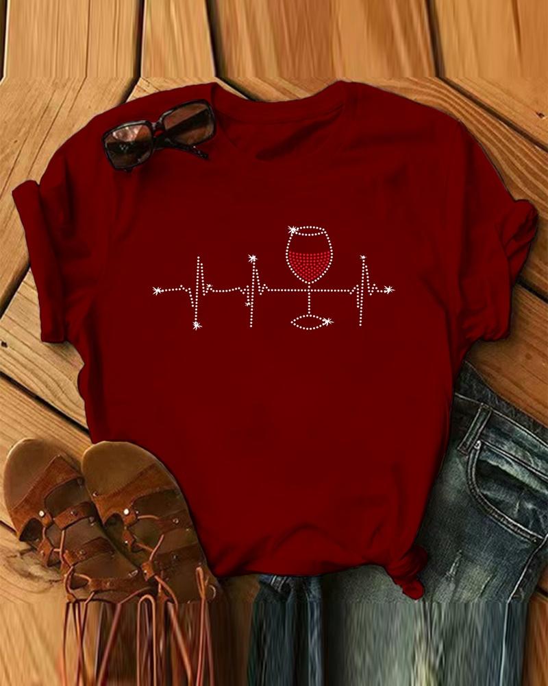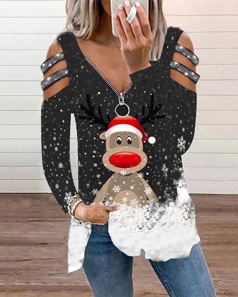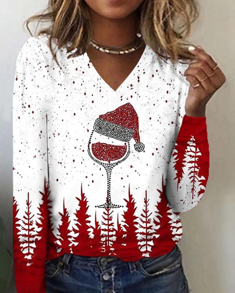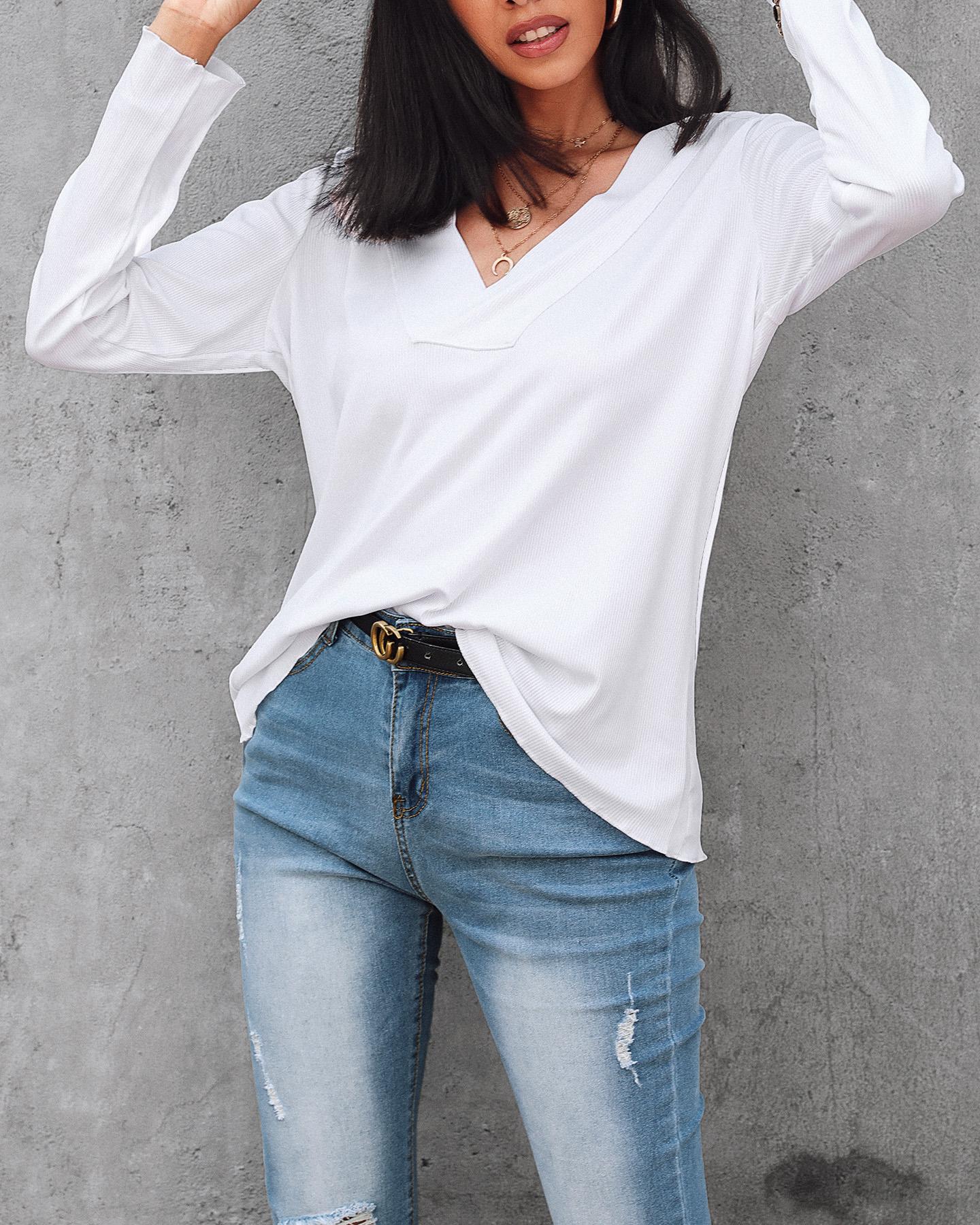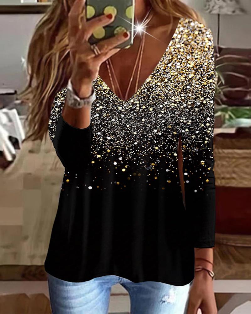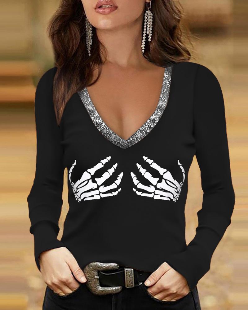 Rhinestone V-Neck Long Sleeve Casual Tee |
