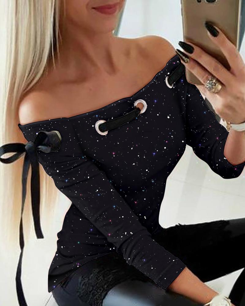 Glitter Grommet Eyelet Tied Detail Off Shoulder Top |