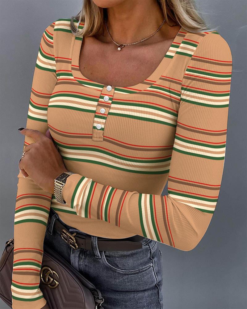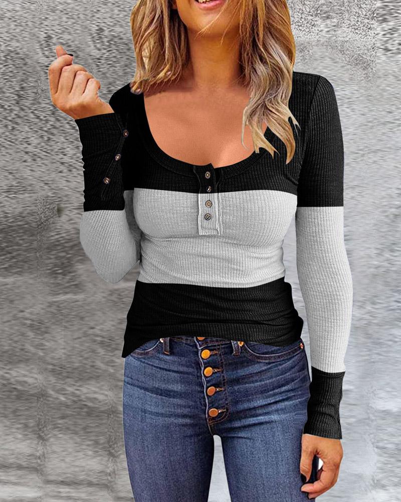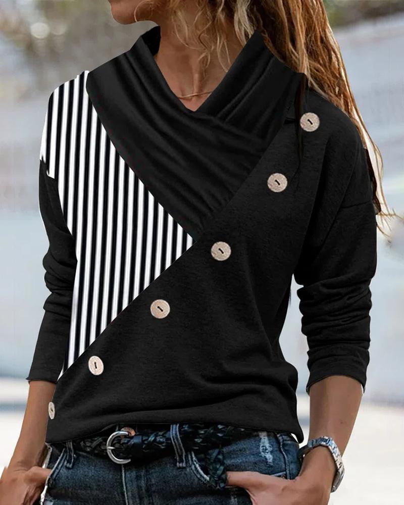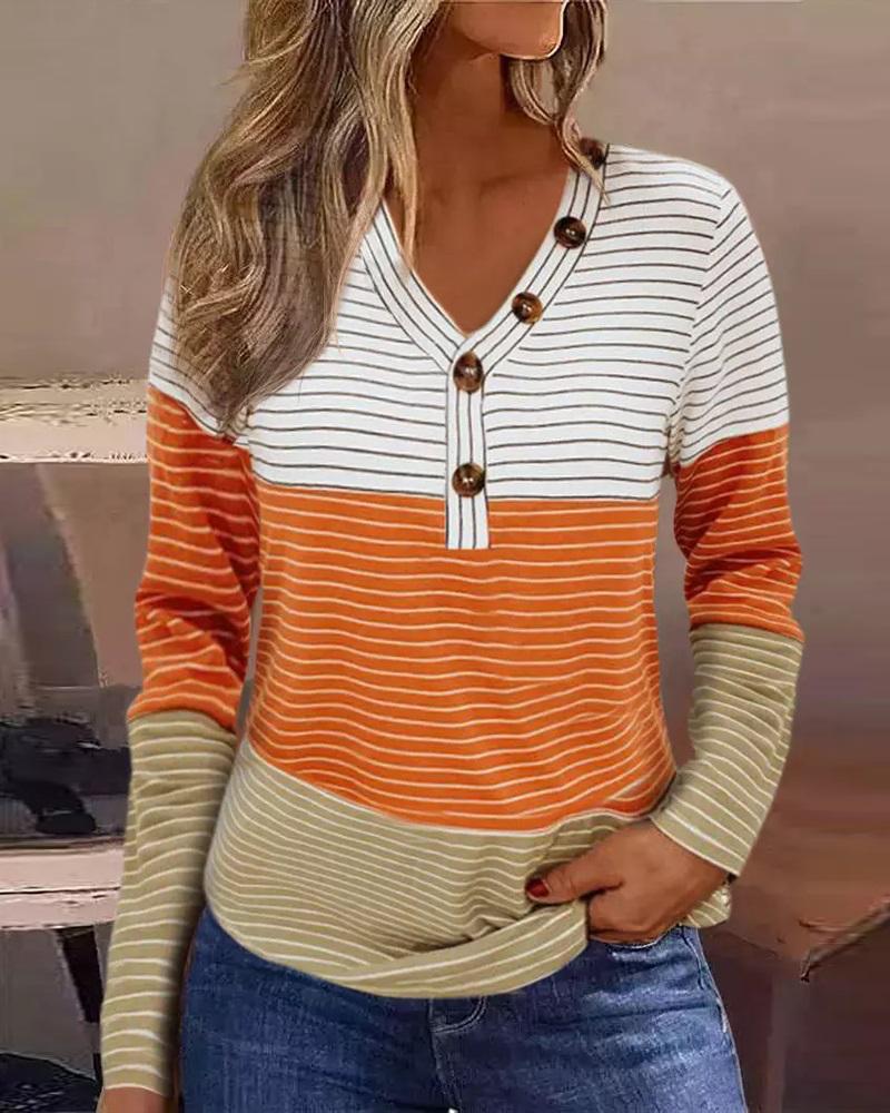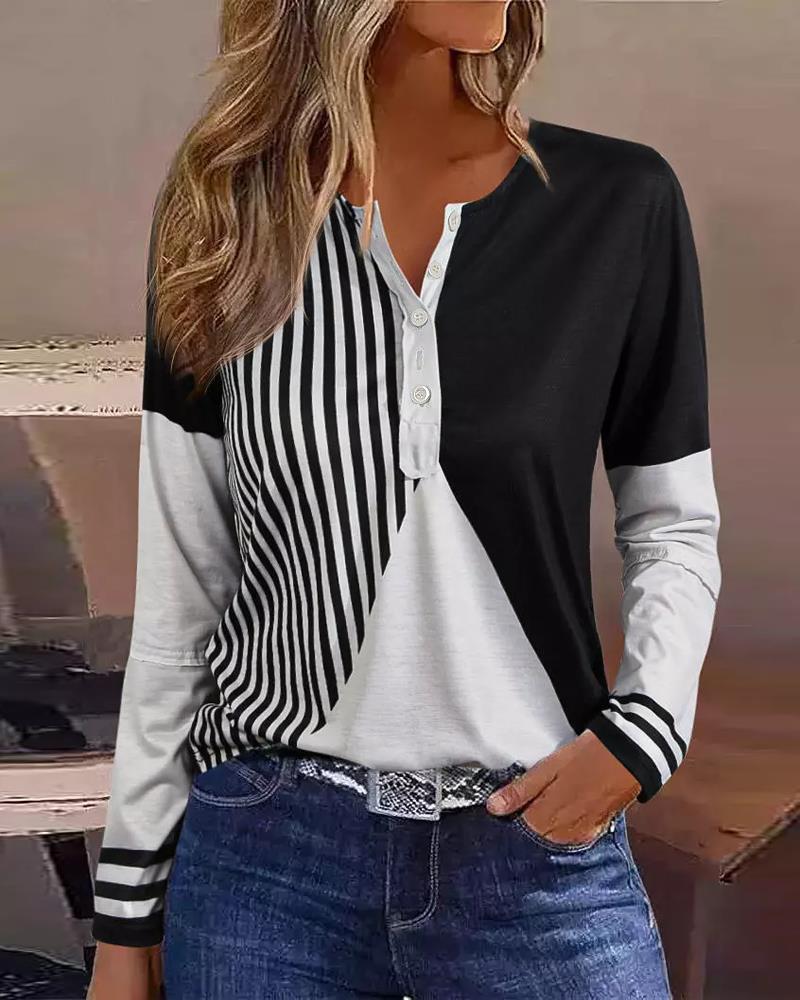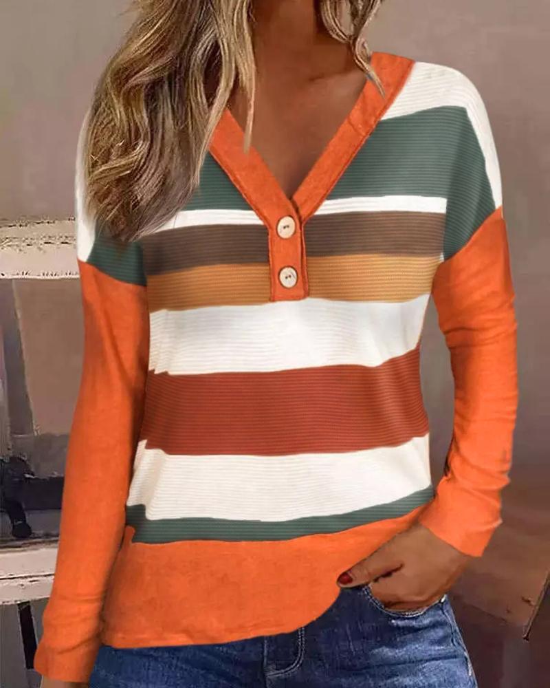 Colorblock Striped Print Button Front Long Sleeve Top |
