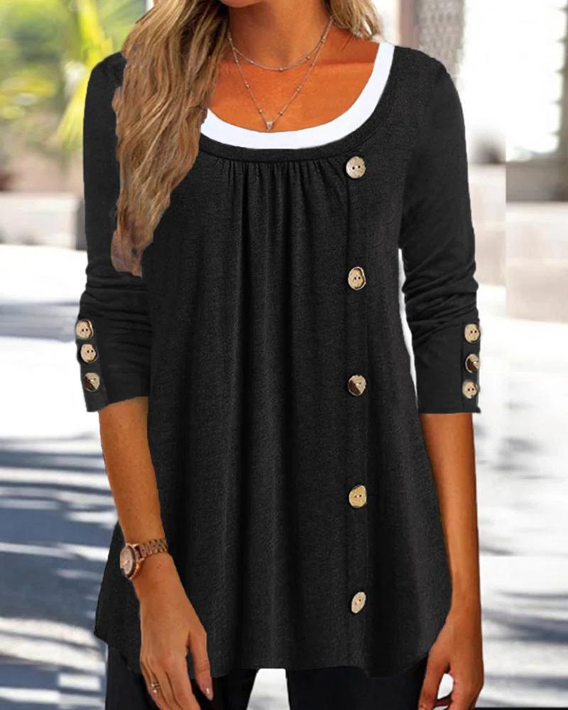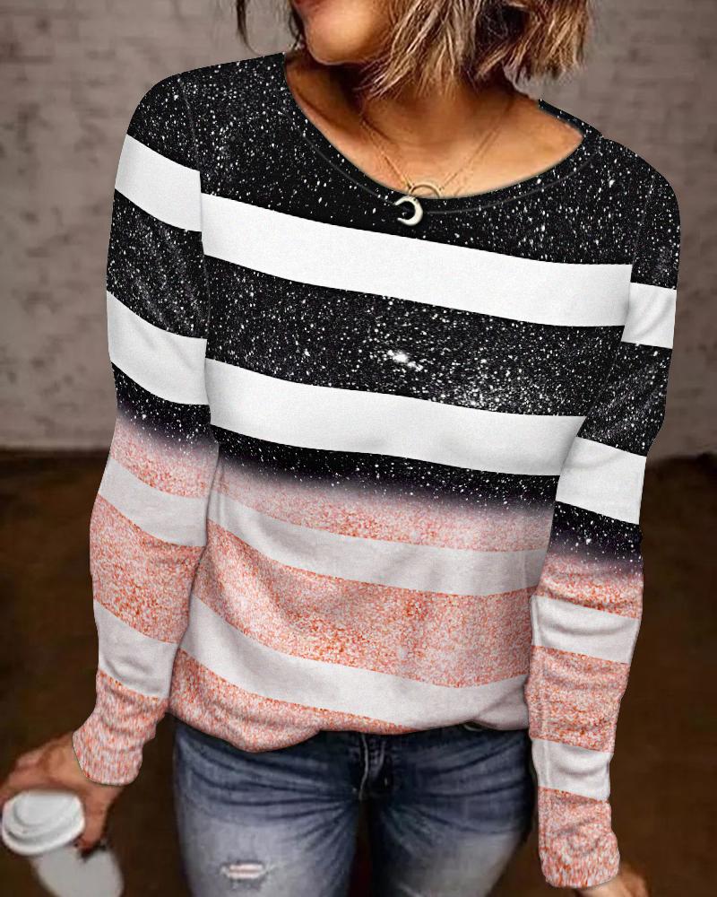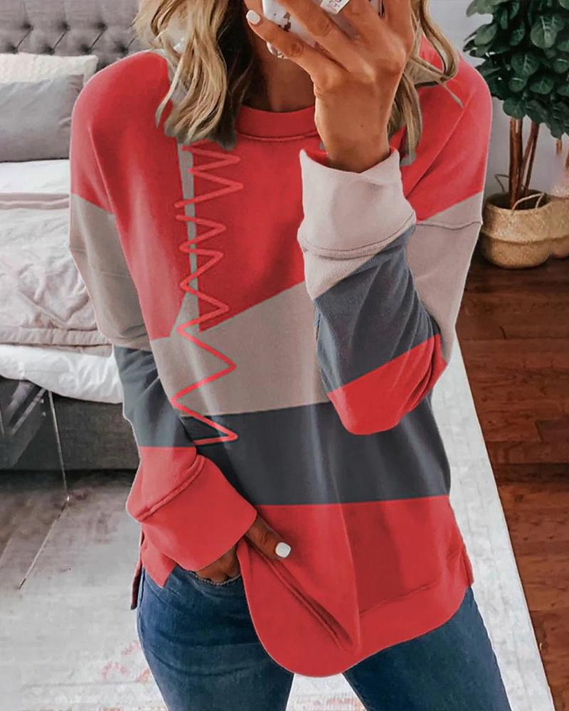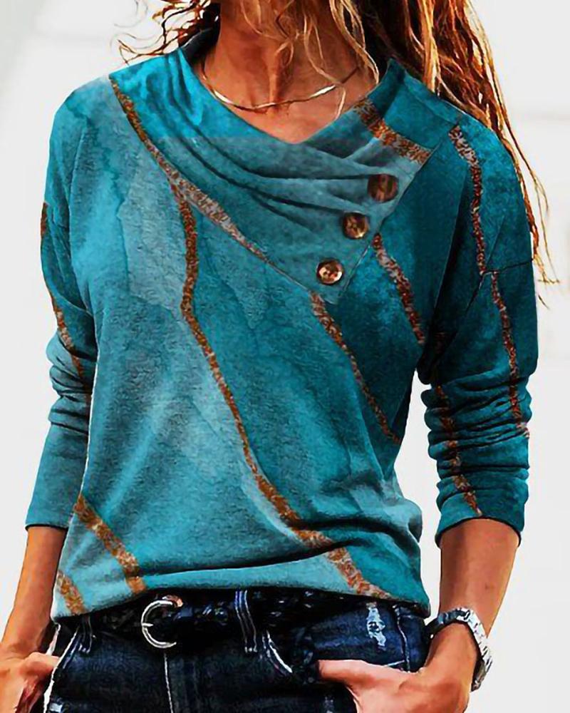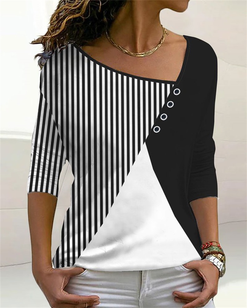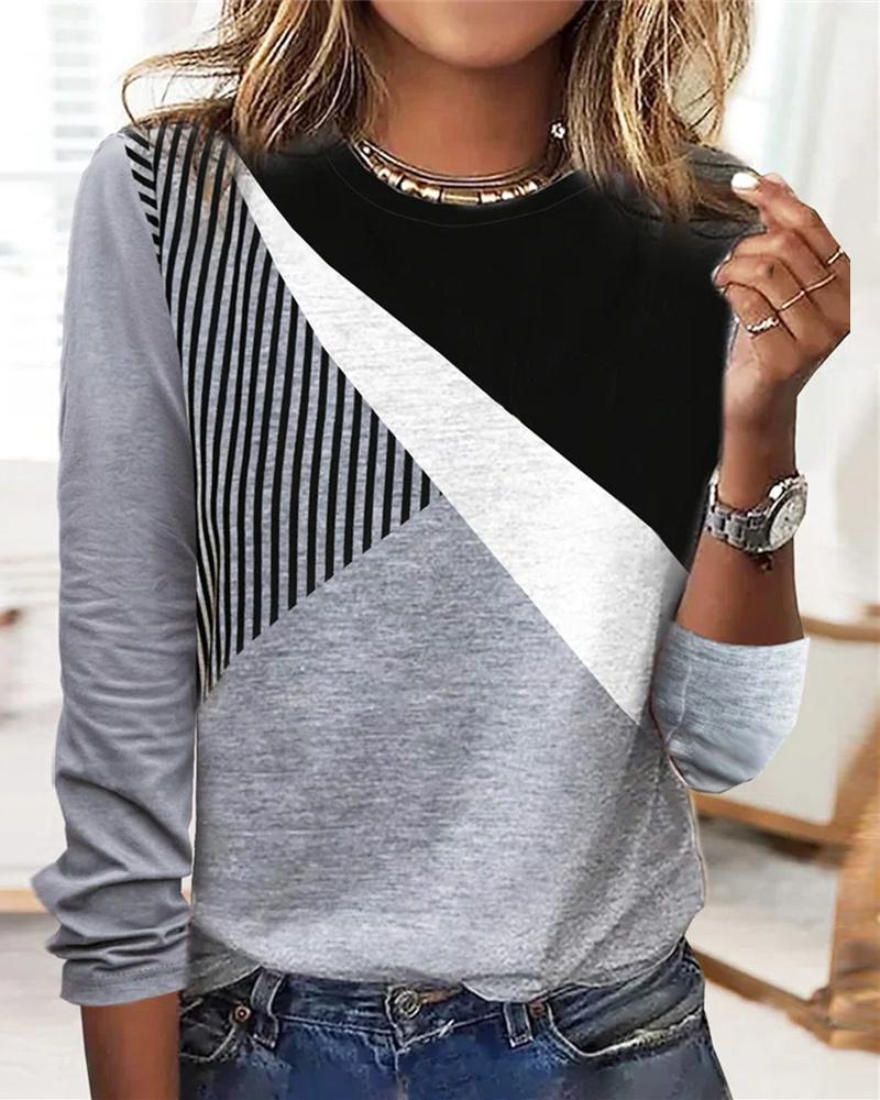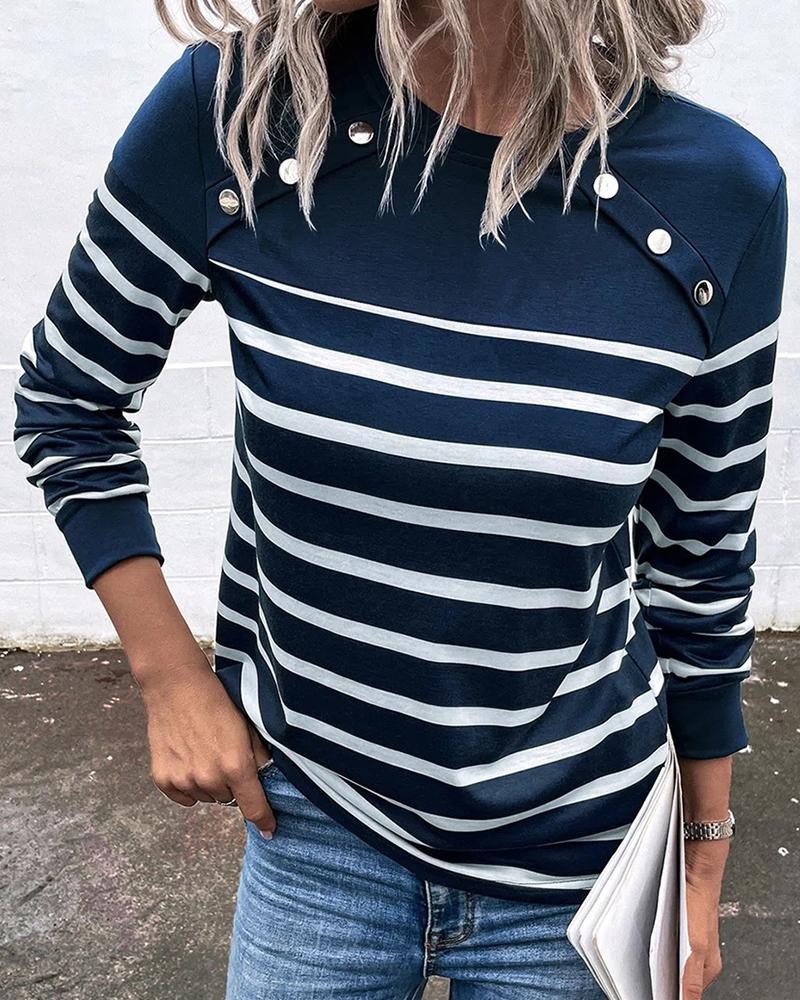 Colorblock Striped Print Button Front Long Sleeve Top |
