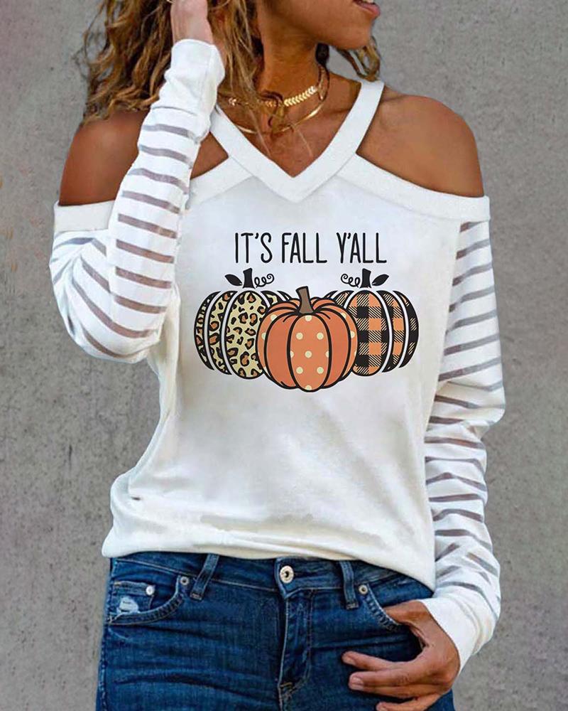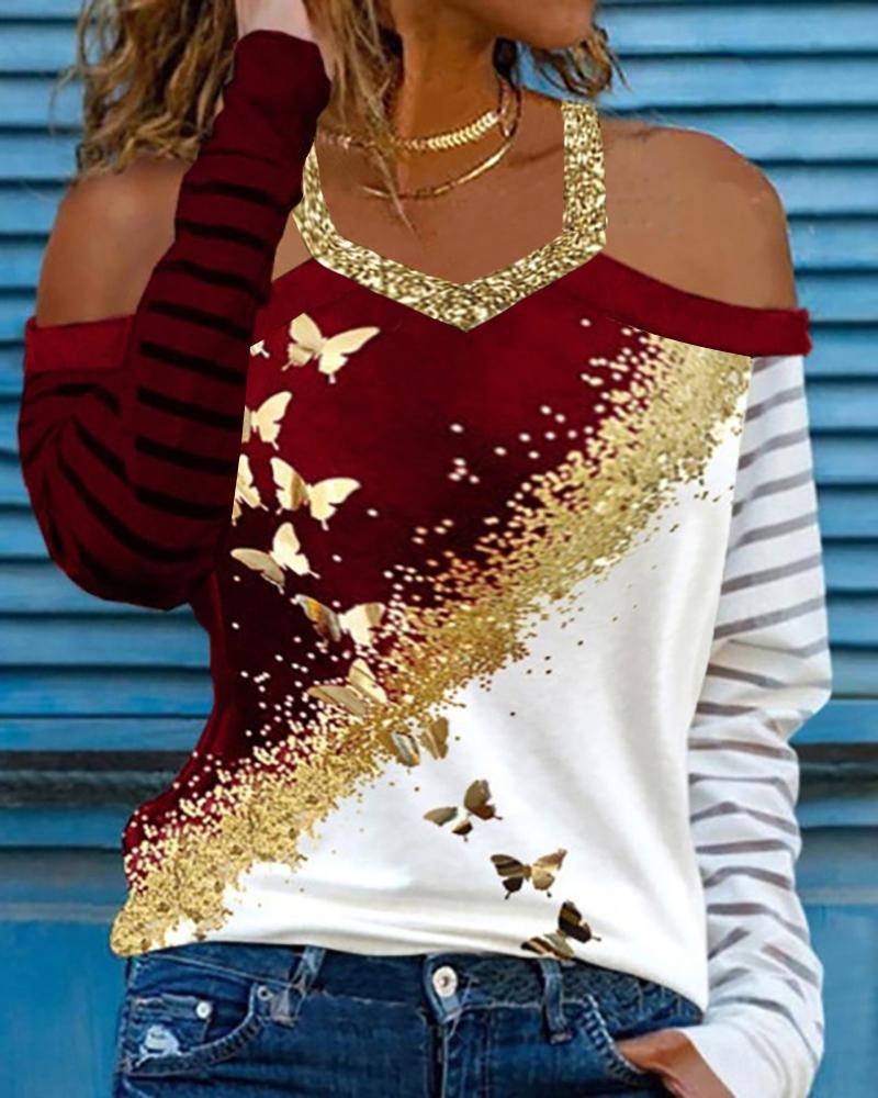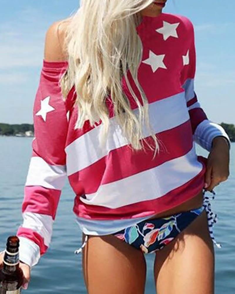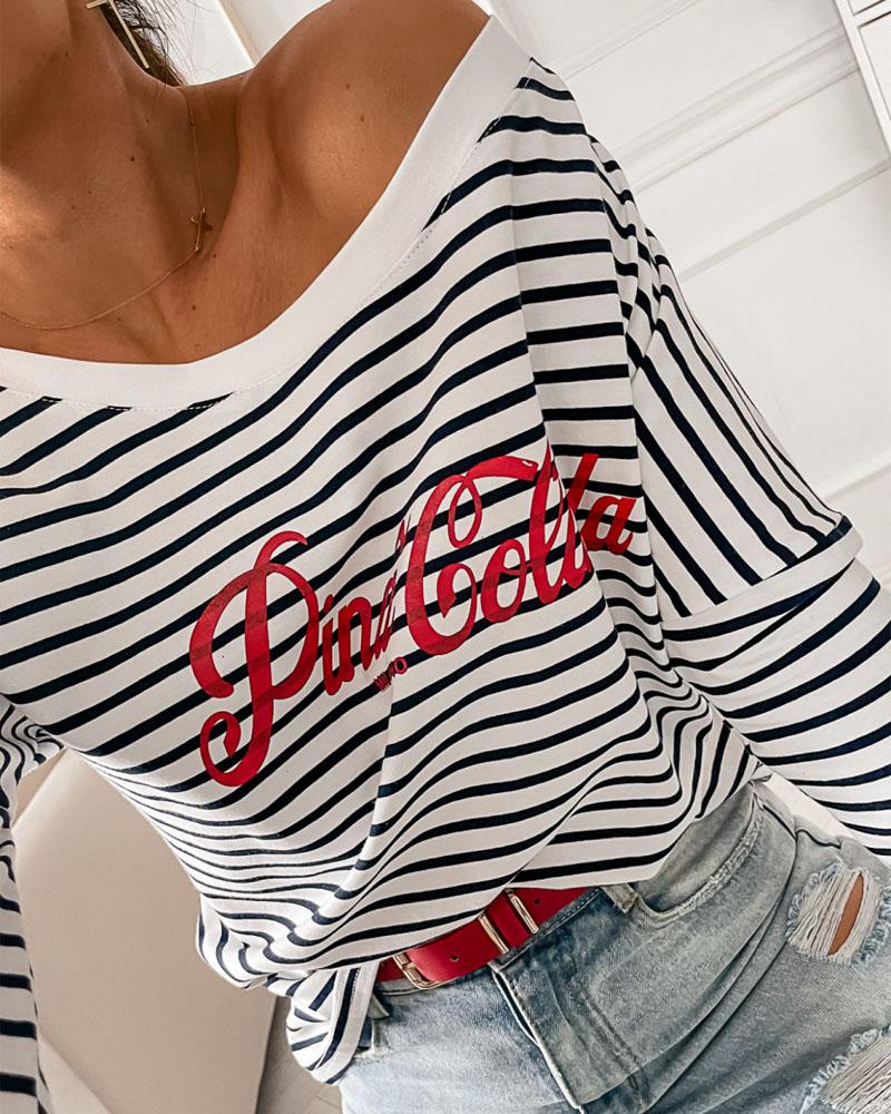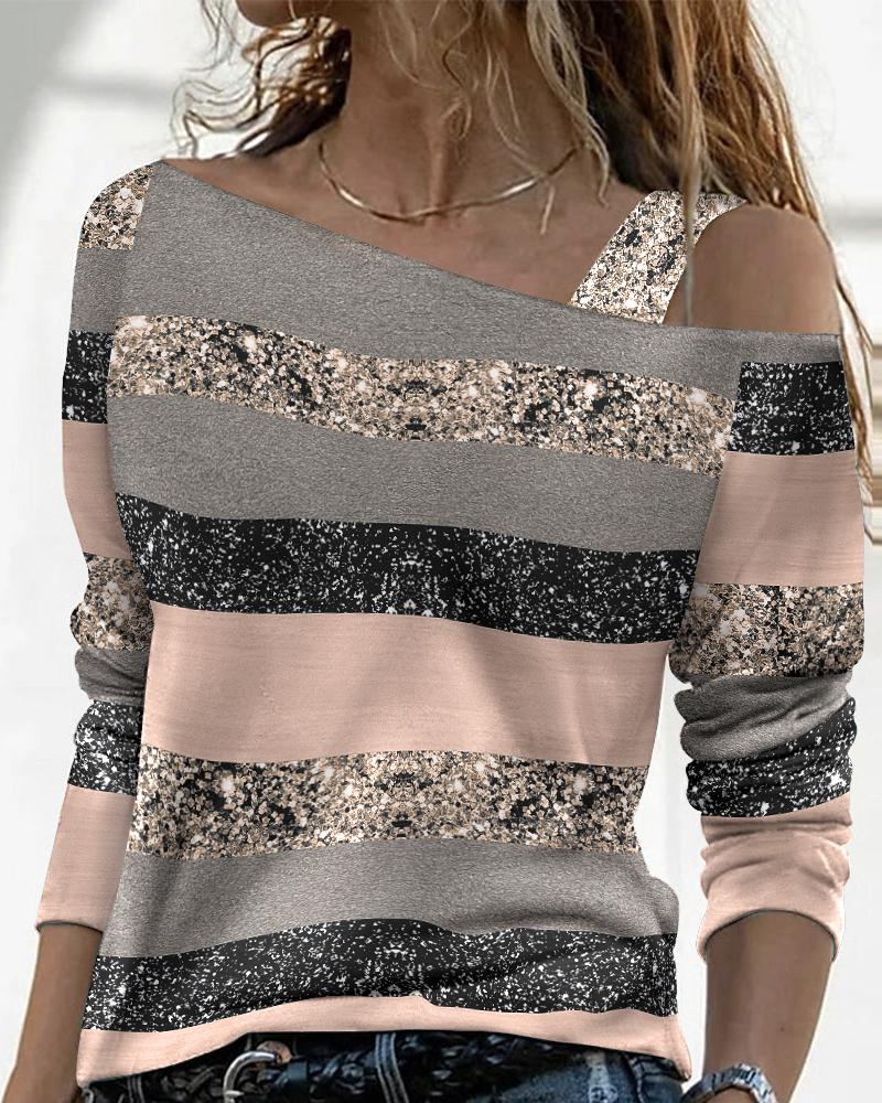 Striped Print Cold Shoulder Casual T-shirt |