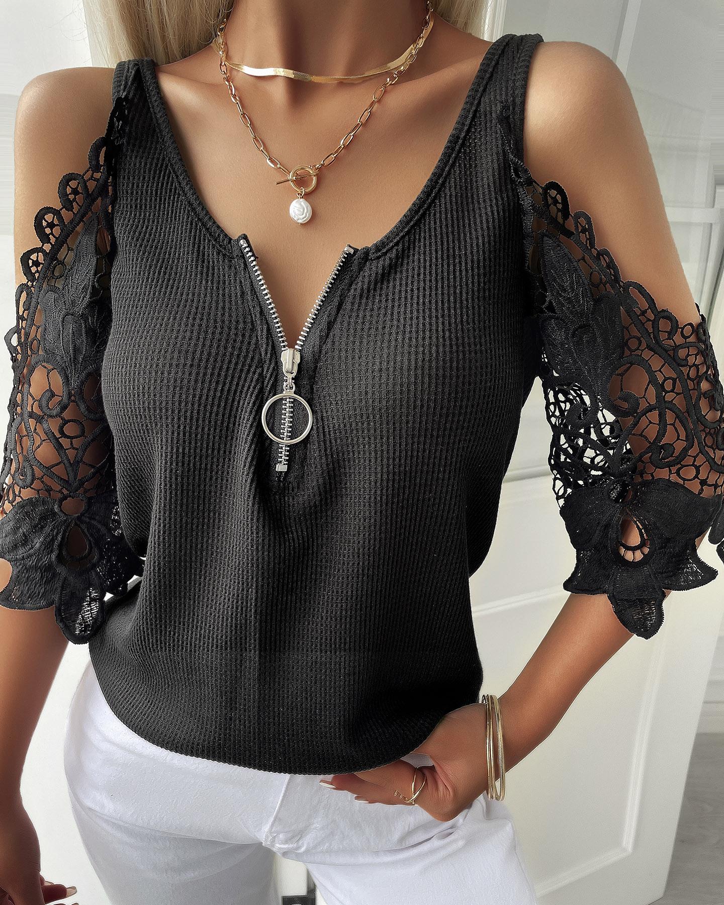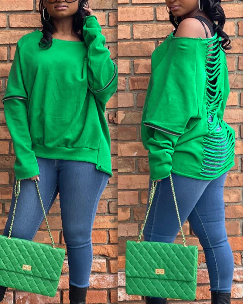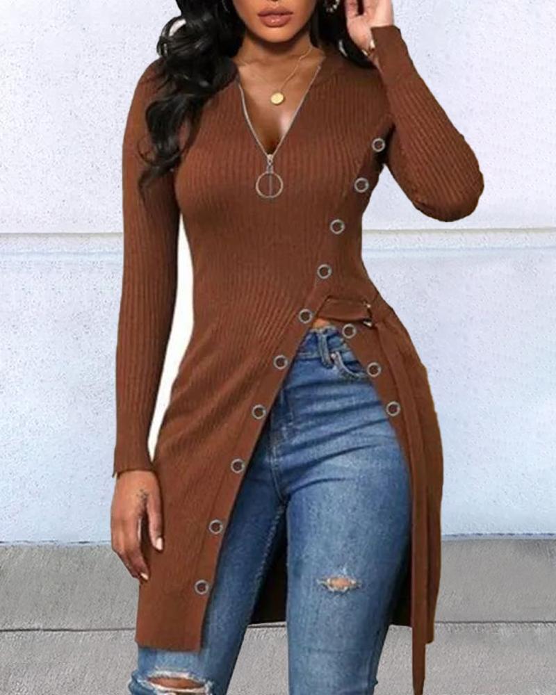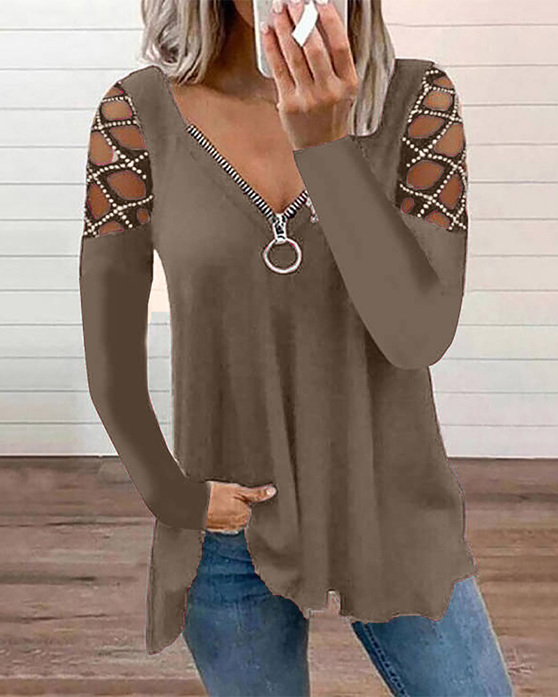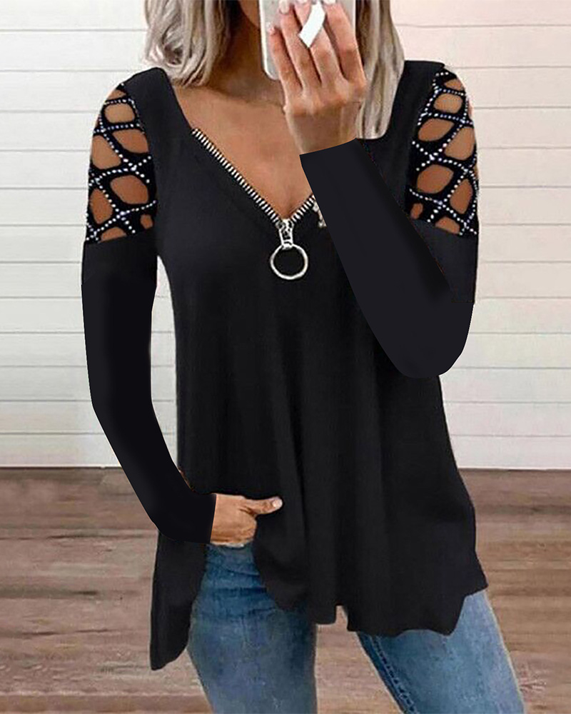 Studded Hollow-Out Zipper Front Long Sleeve Top |