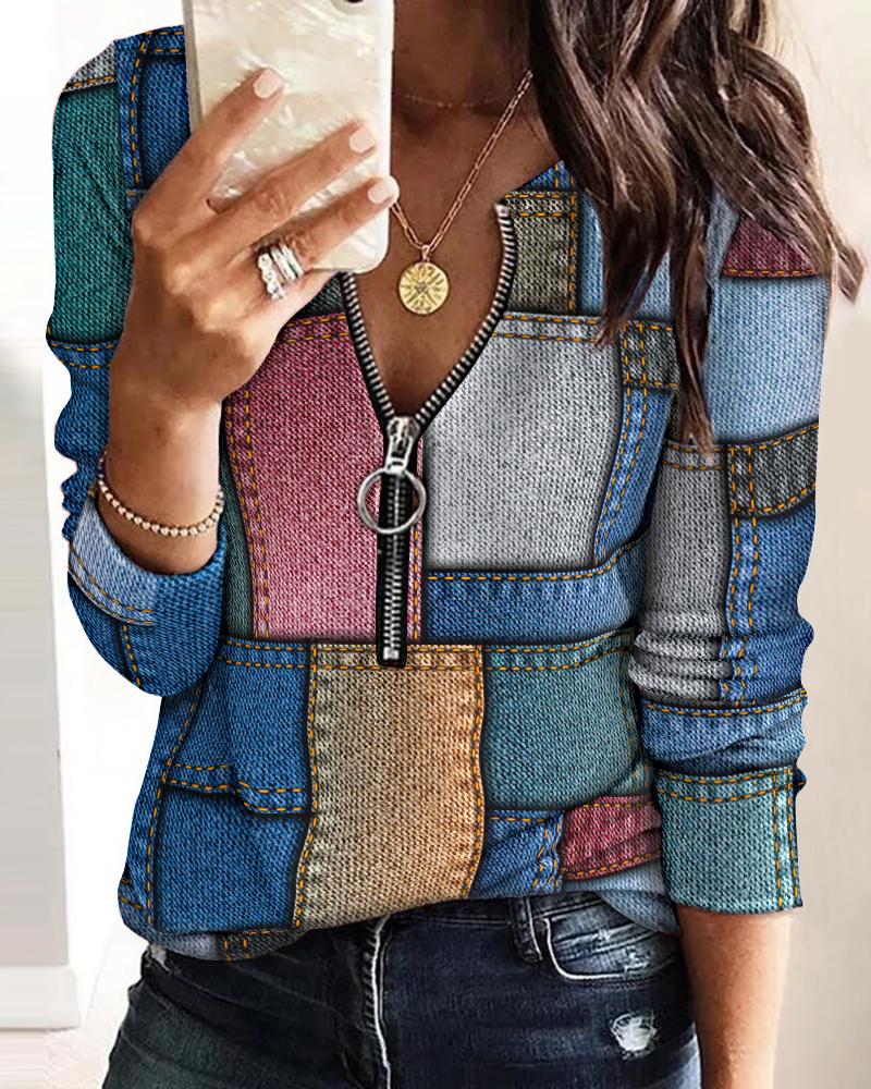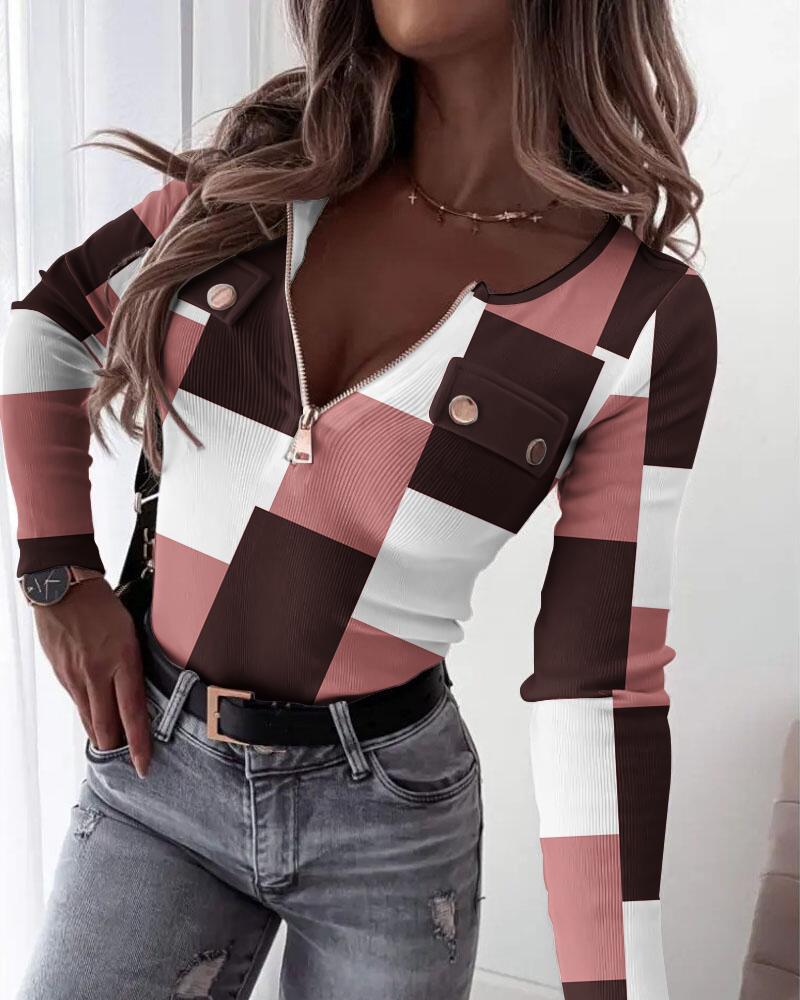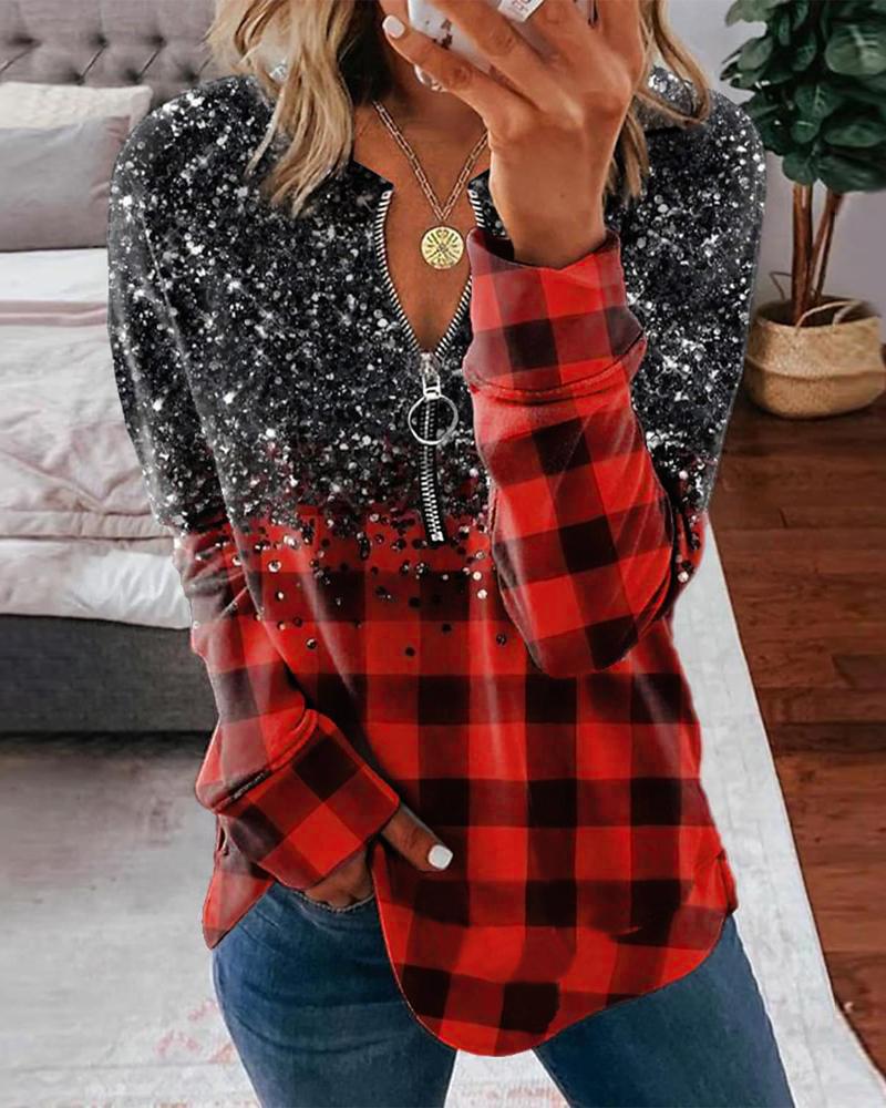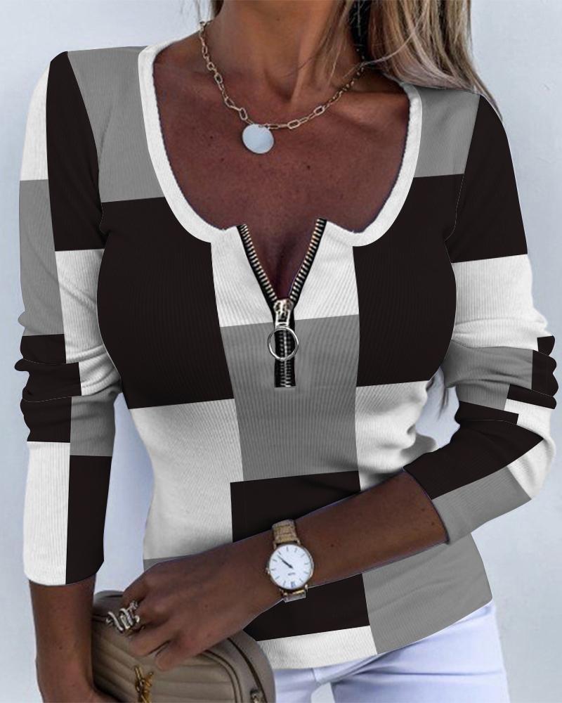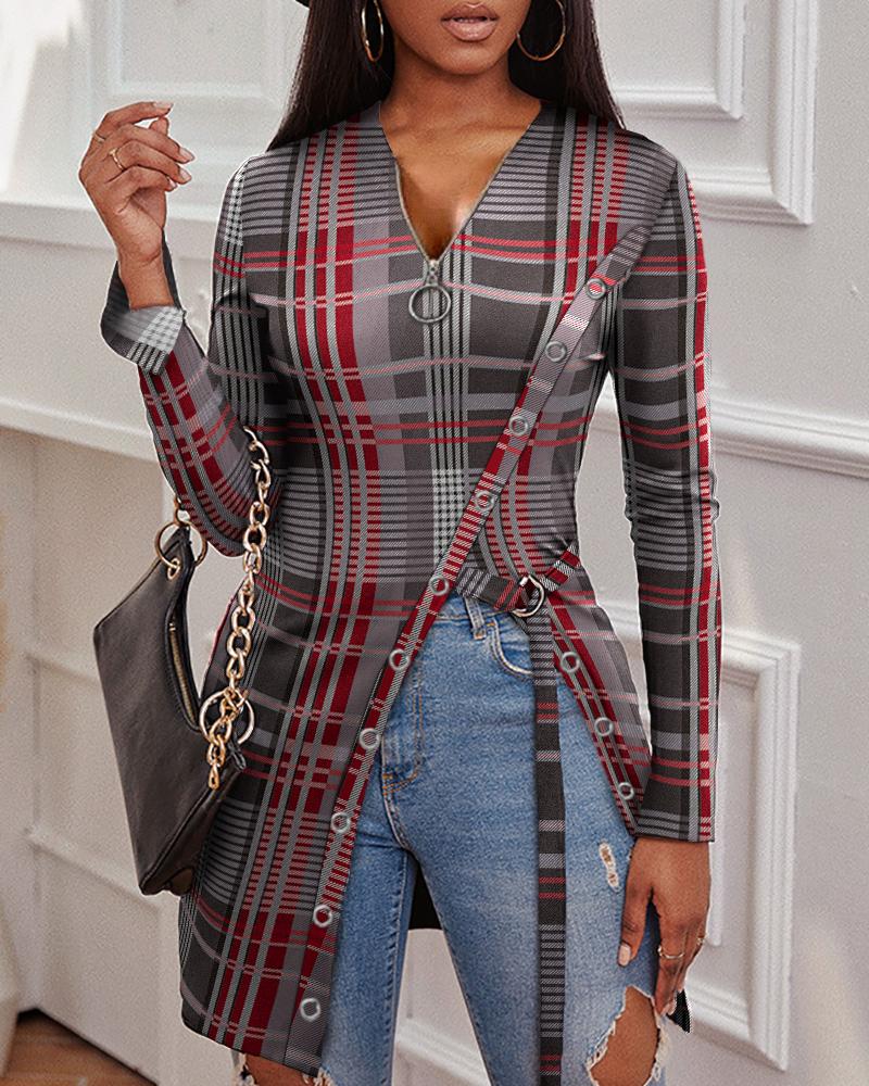 Plaid Print Zipper Front Long Sleeve Top |