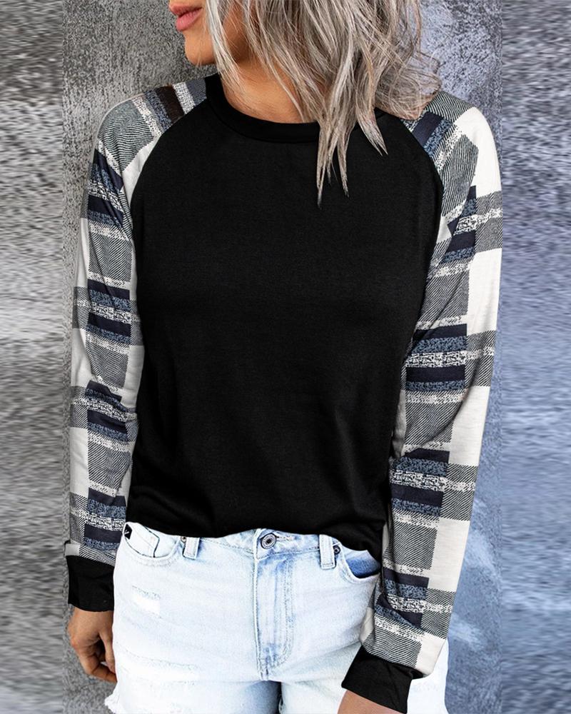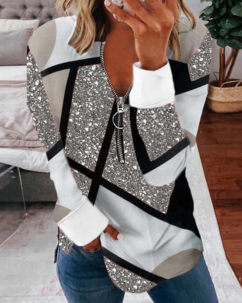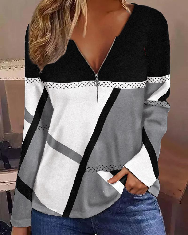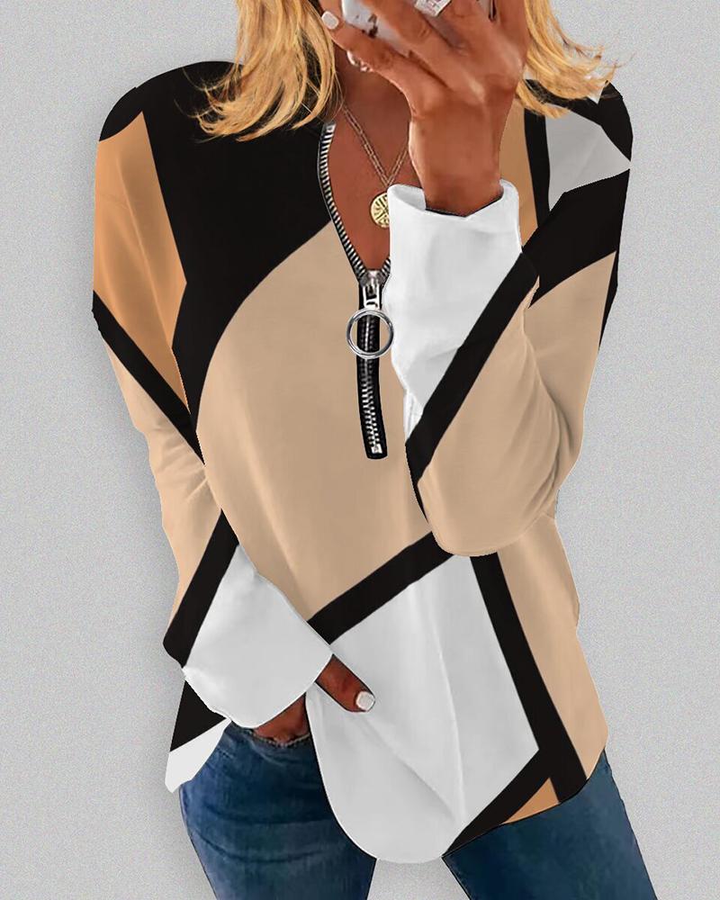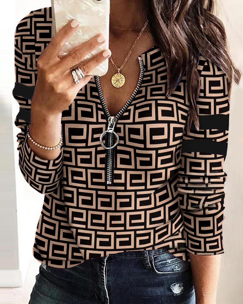 Plaid Print Zipper Front Long Sleeve Top |