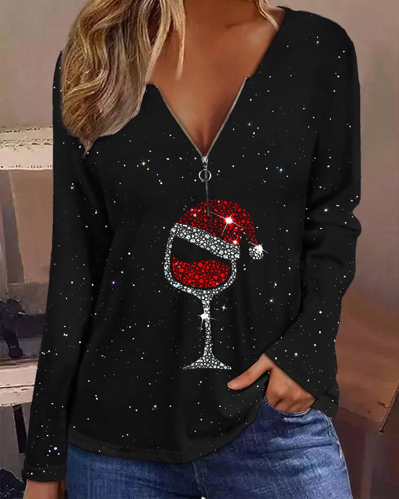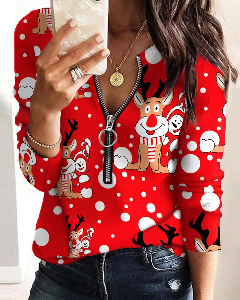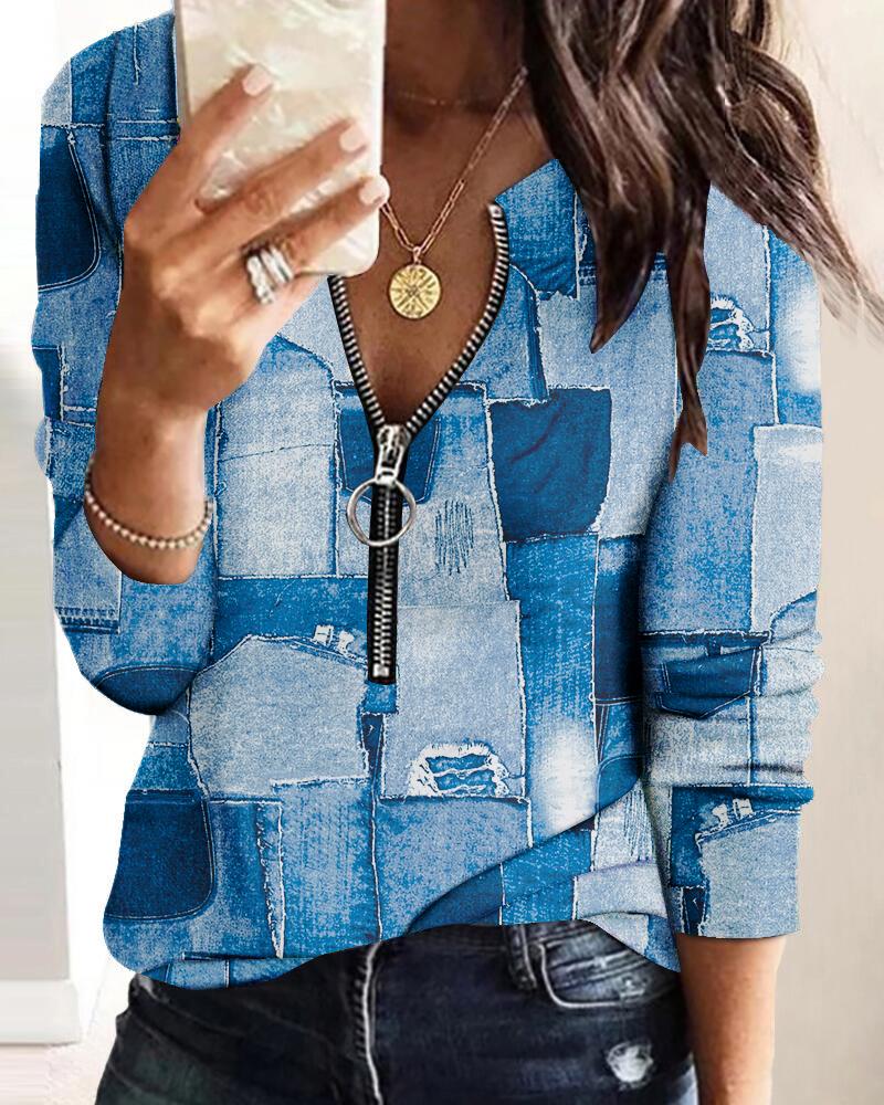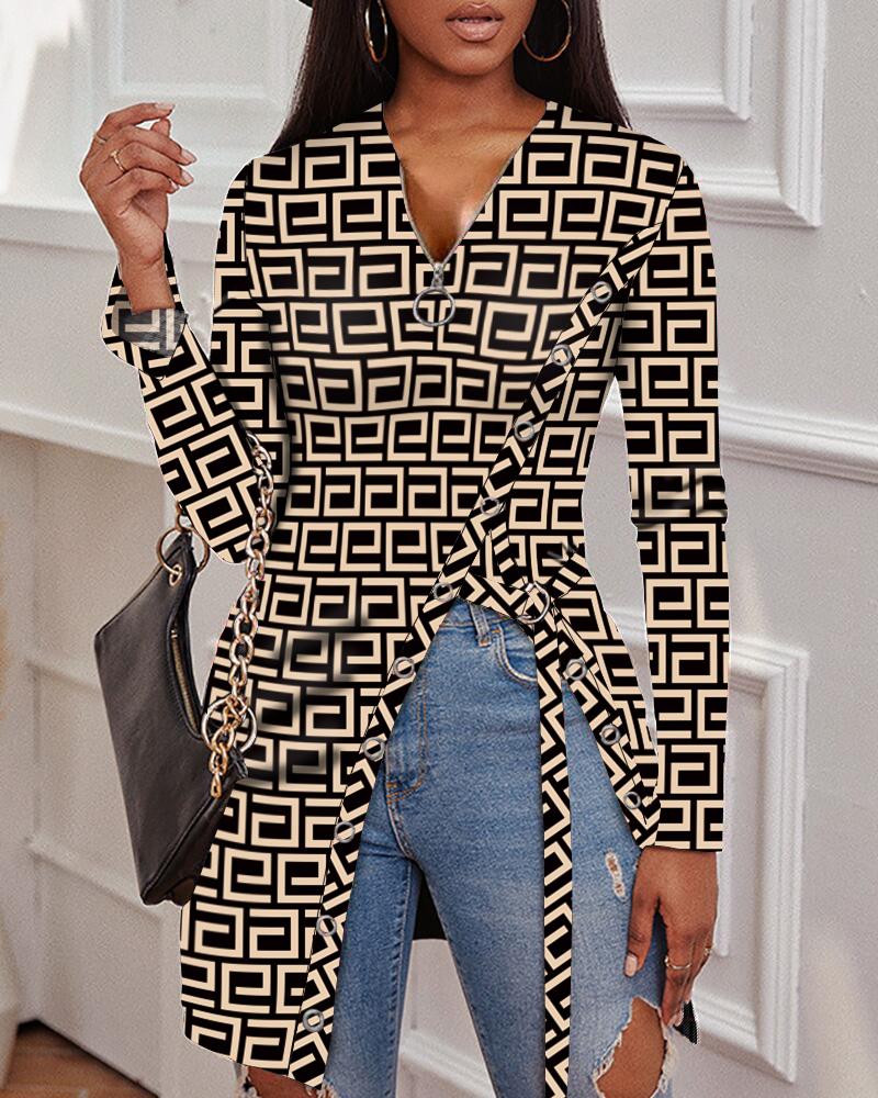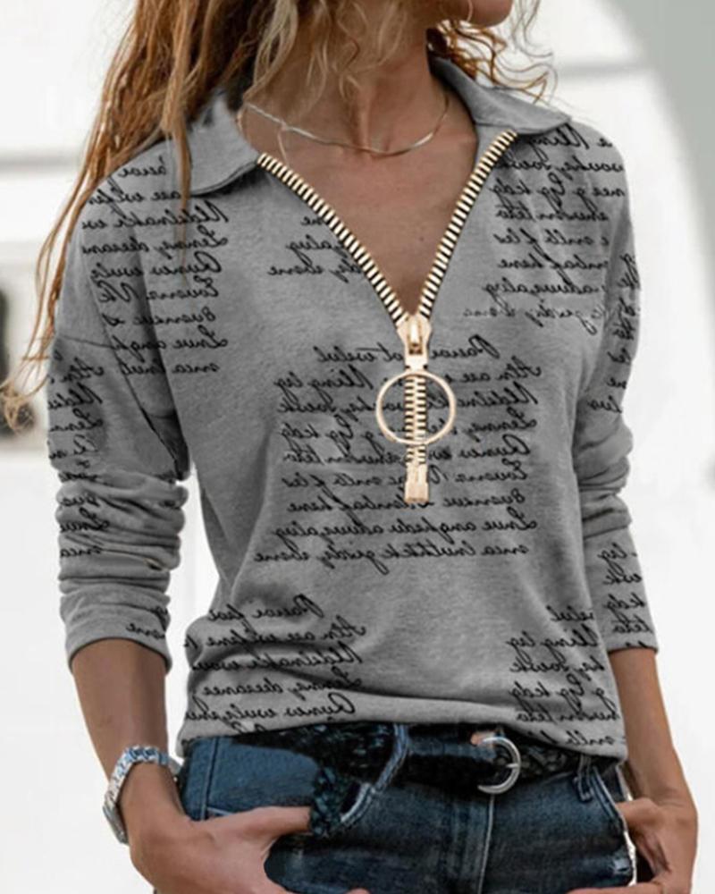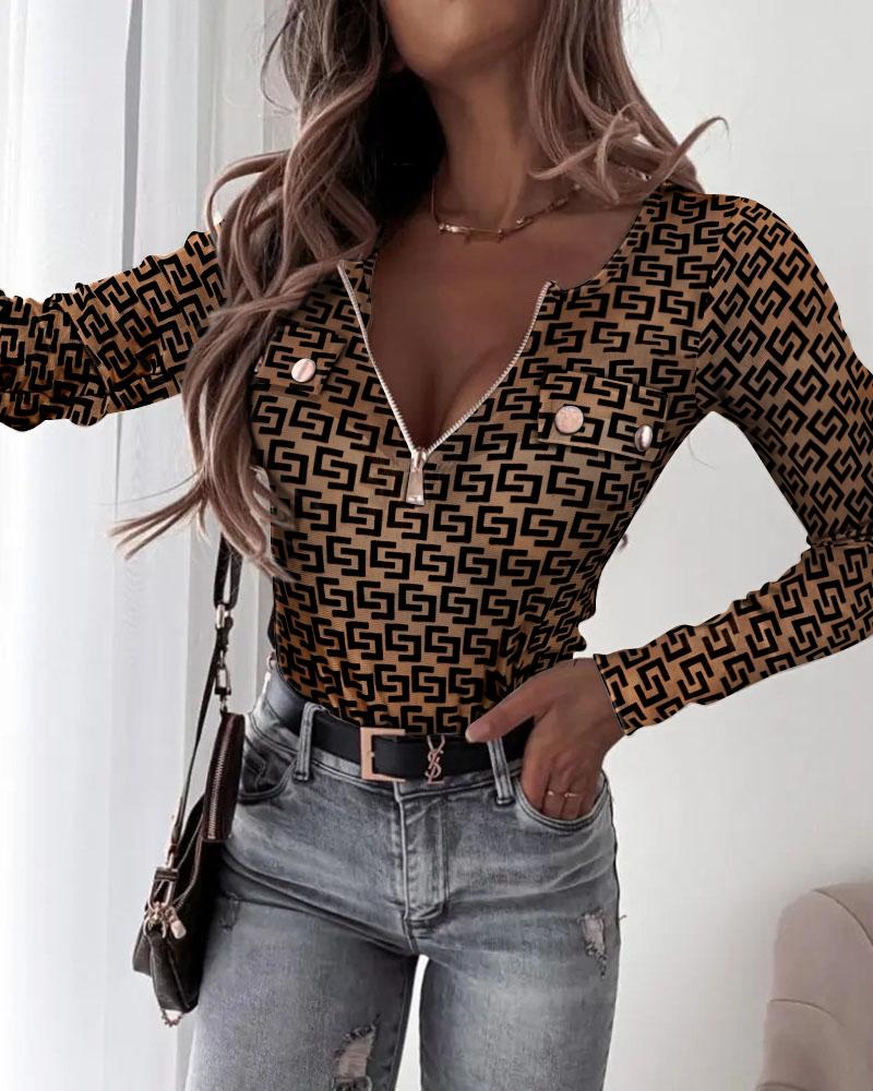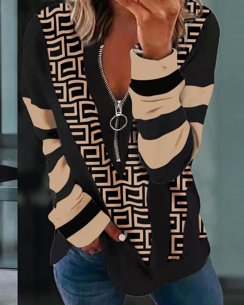 Plants Print Zip Front Long Sleeve Top |