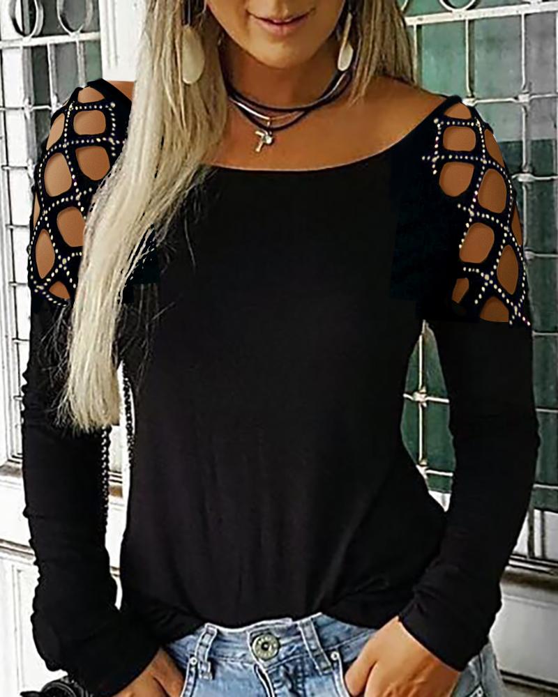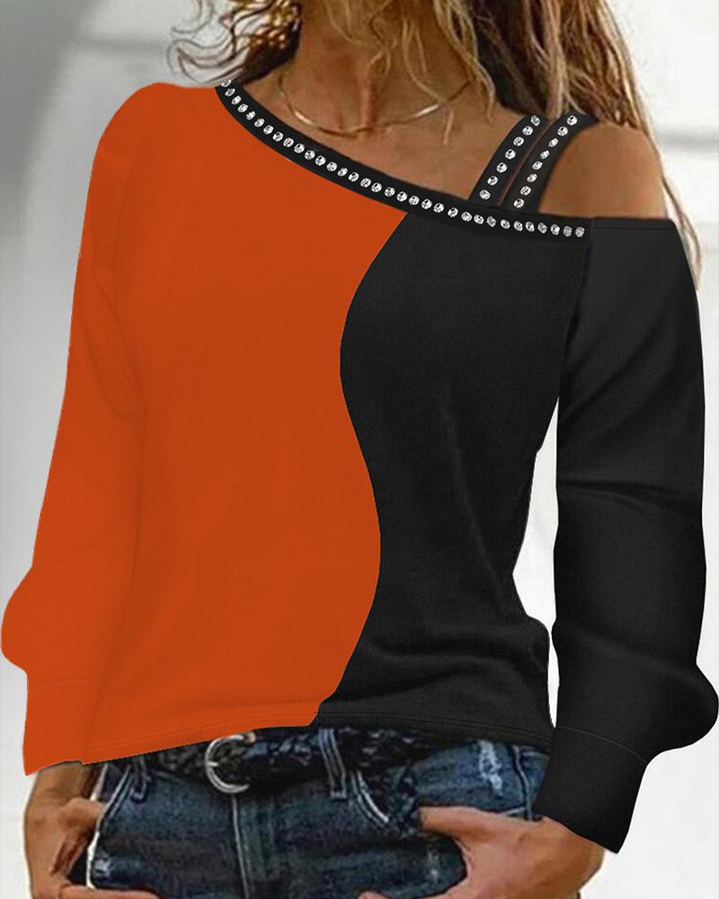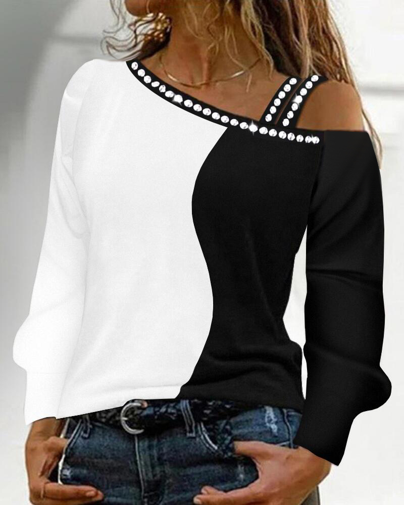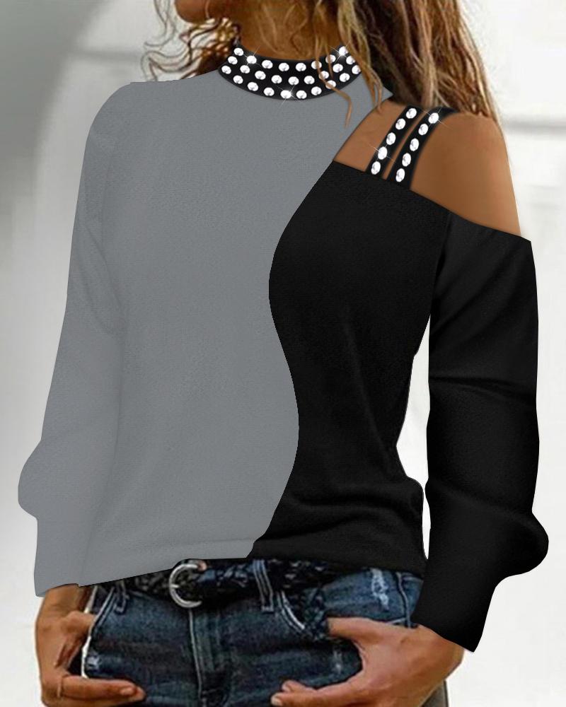 Rhinestone Decor Colorblock Cold Shoulder Top |