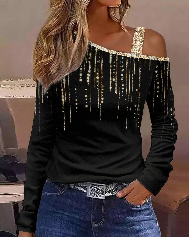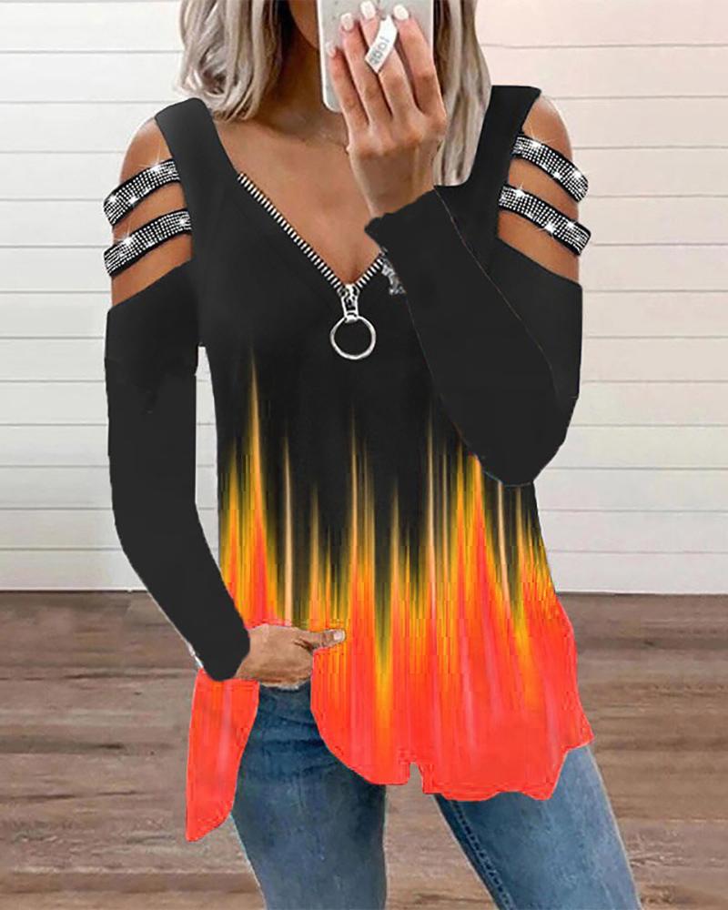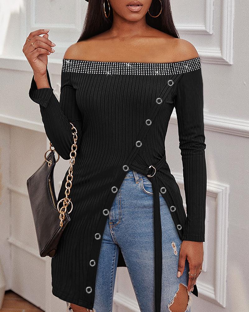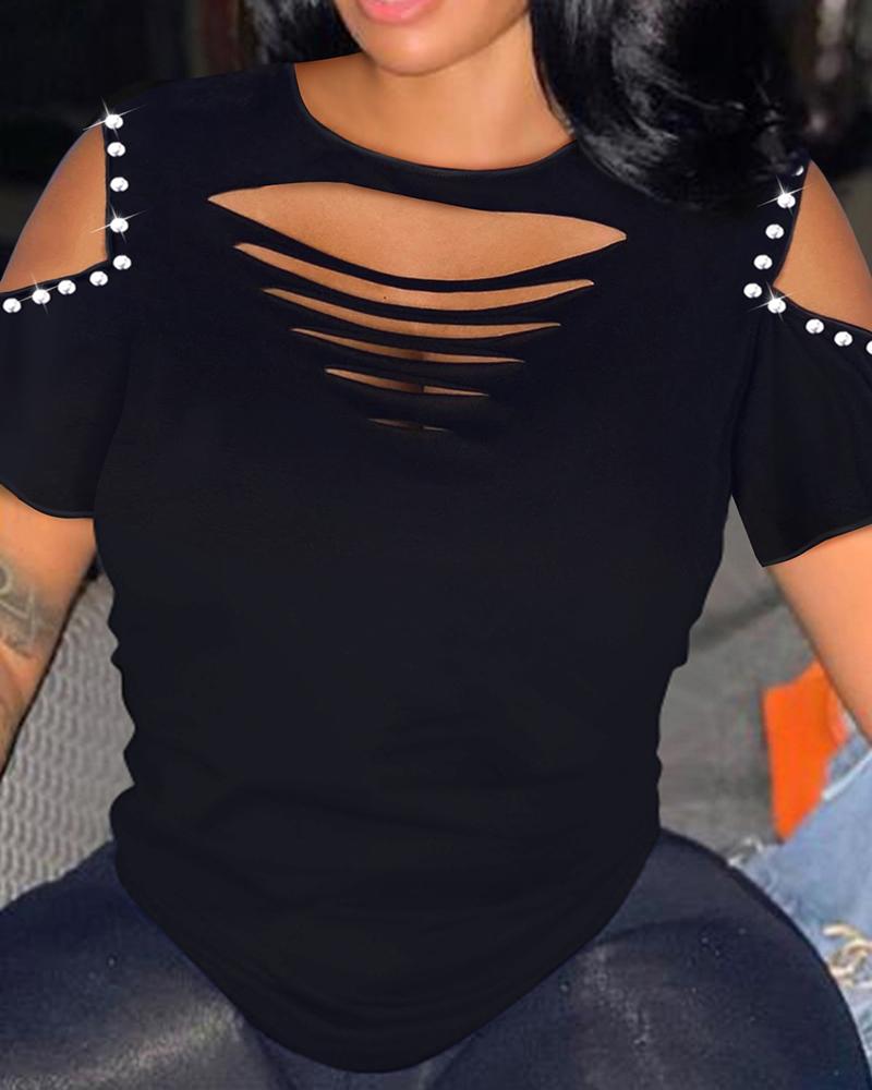Rhinestone Decor Colorblock Cold Shoulder Top |