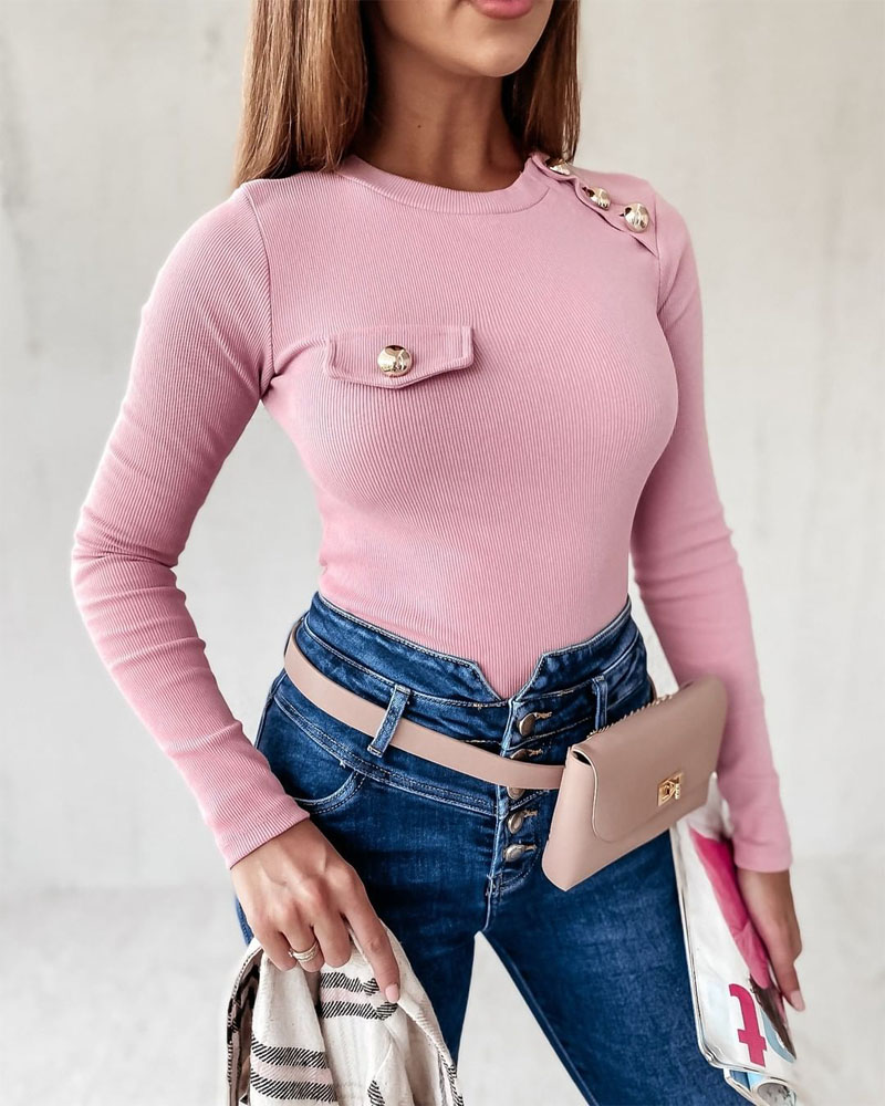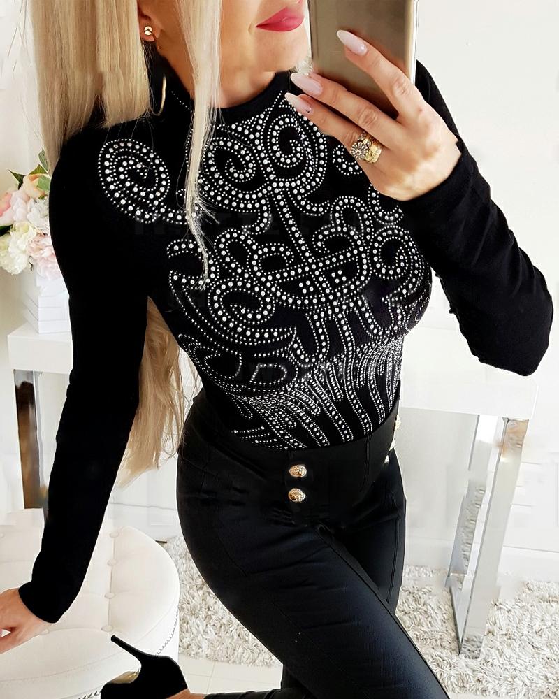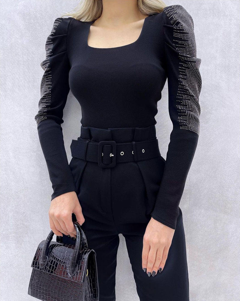 U-Neck Long Sleeve Rhinestone Skinny Top |