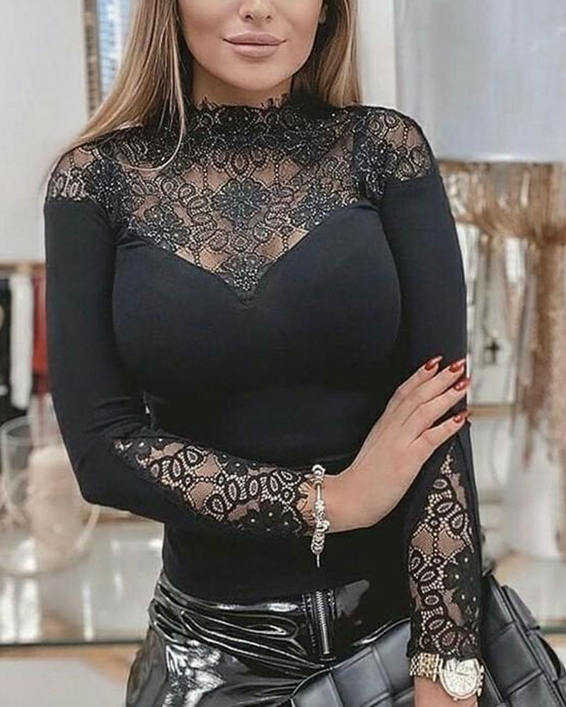 Glitter Sheer Mesh Long Sleeve High Neck Top |