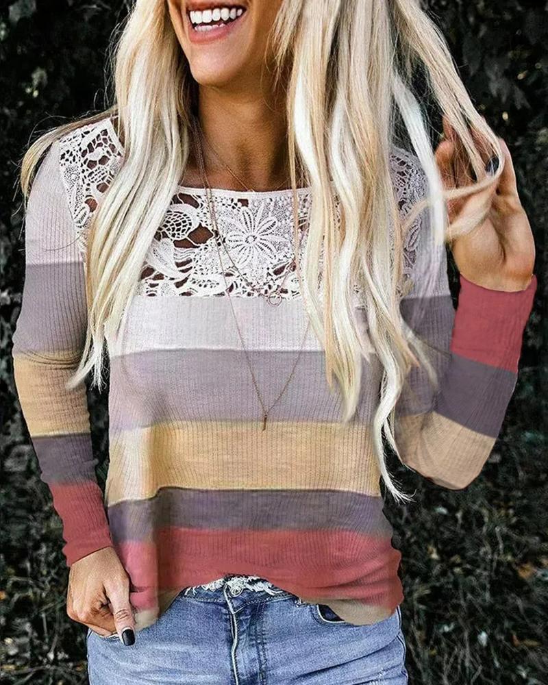 Striped Contrast Lace Long Sleeve Top |