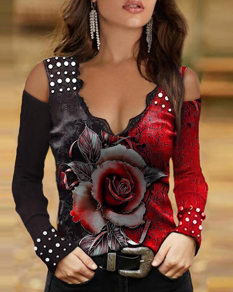 Rose Print Cold Shoulder Batwing Sleeve Top |