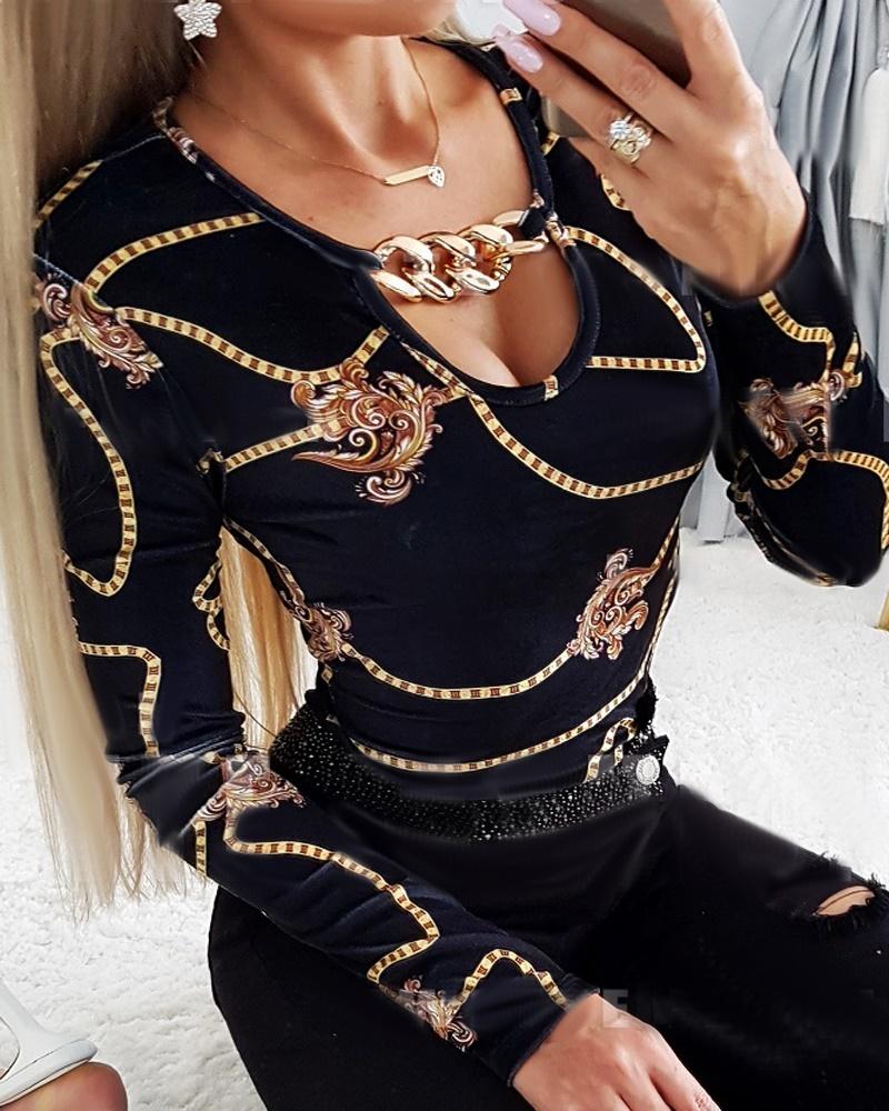 Figure Print Hollow-out Cold Shoulder Top |