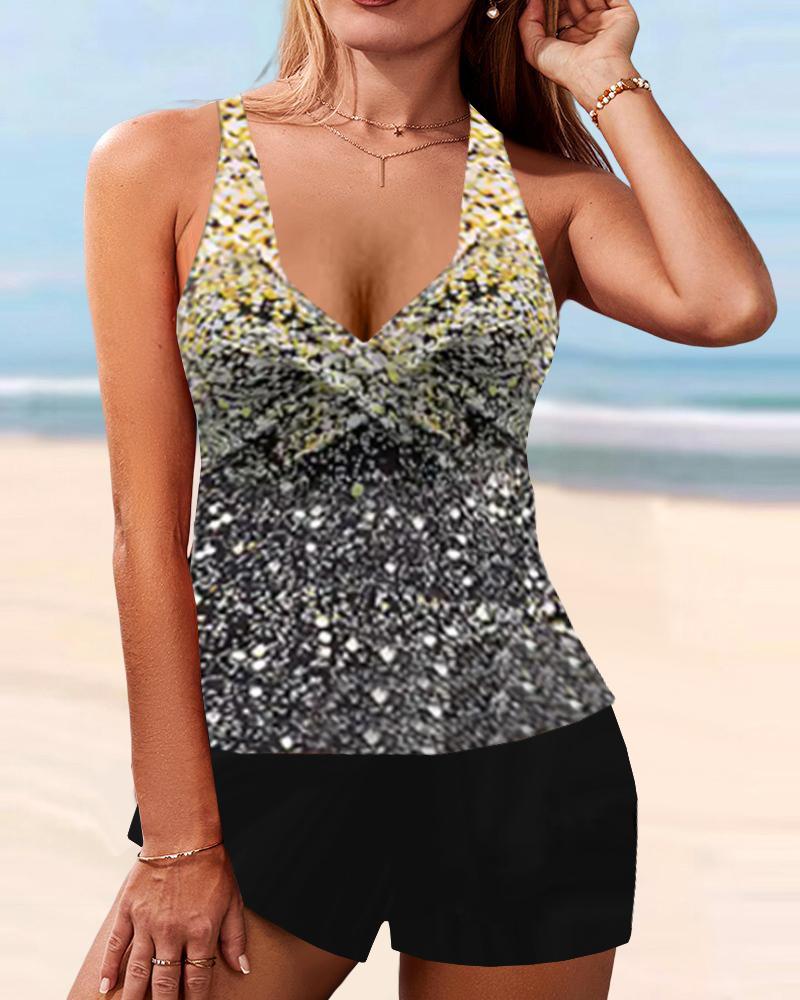 Graphic Print Ombre V-Neck Tankini Set |
