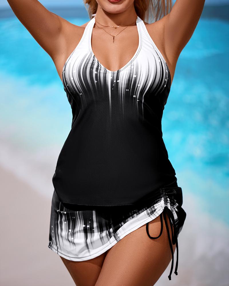 3PCS Print Halter Tankini Set With Drawstring Skirt |